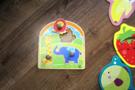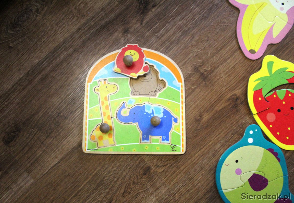 2) Ekologiczna zabawka z drewna: puzzle z motywem zwierzątek z uchwytami, marki HAPE