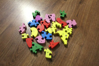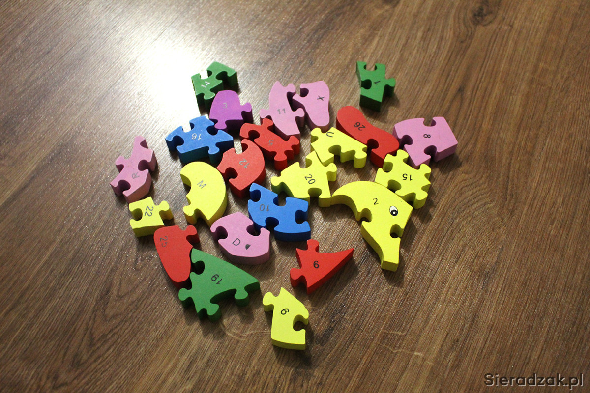 4) Ekologiczne puzzle/klocki drewniane, kolorowe, z oznaczeniem (numerki i literki) - (może brakować paru sztuk)