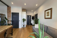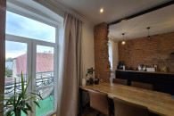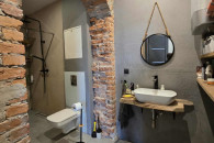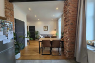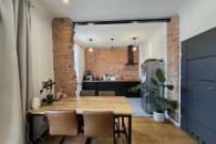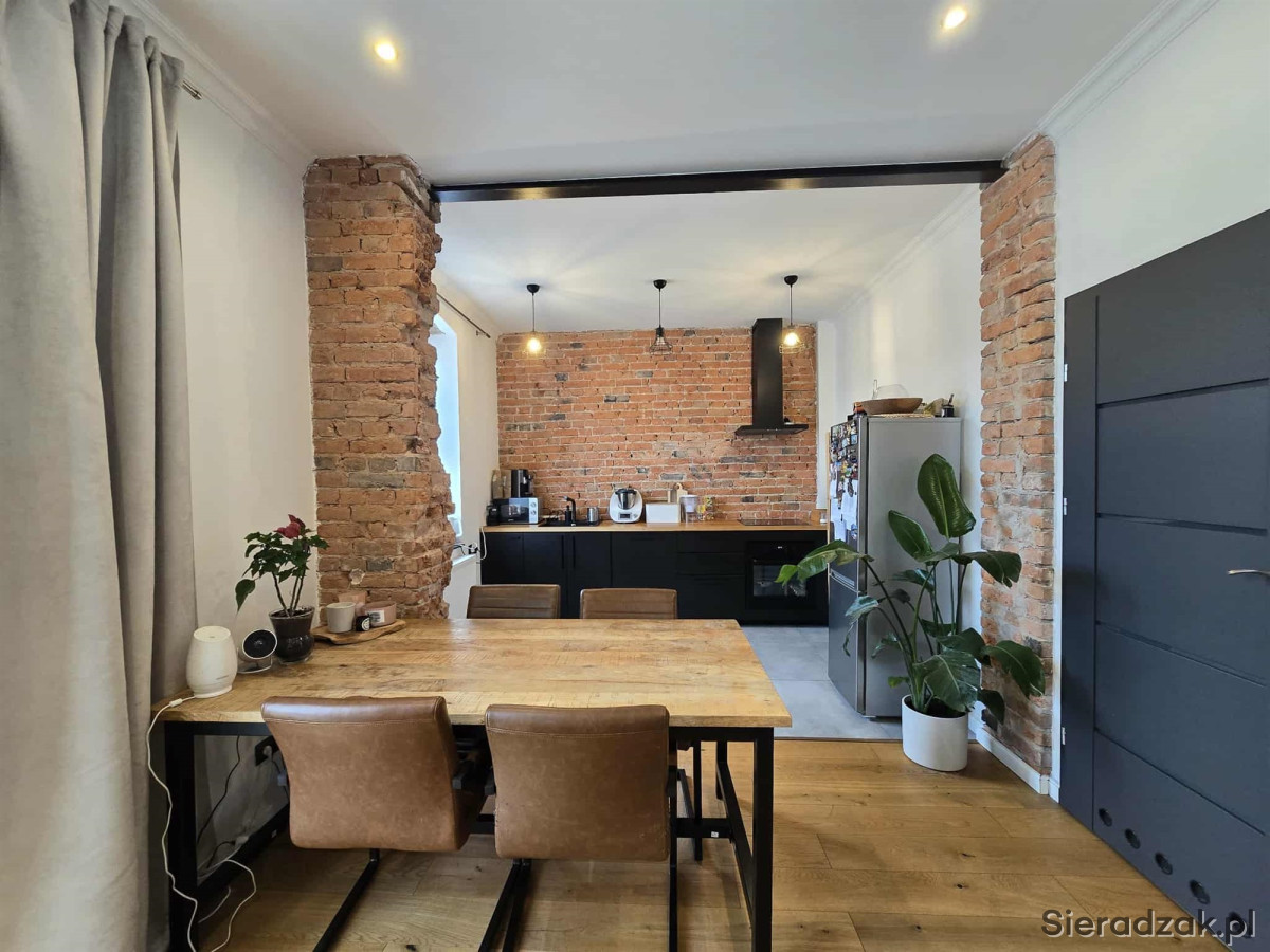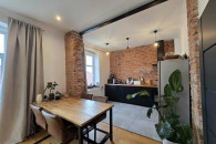 Stylu nadają podłogi wyłożone deską barlinecką, ozdobna cegła na ścianach nadaje charakteru wnętrzu. Oryginalne, drewniane stoły i meble pozostają na wyposażeniu mieszkania.