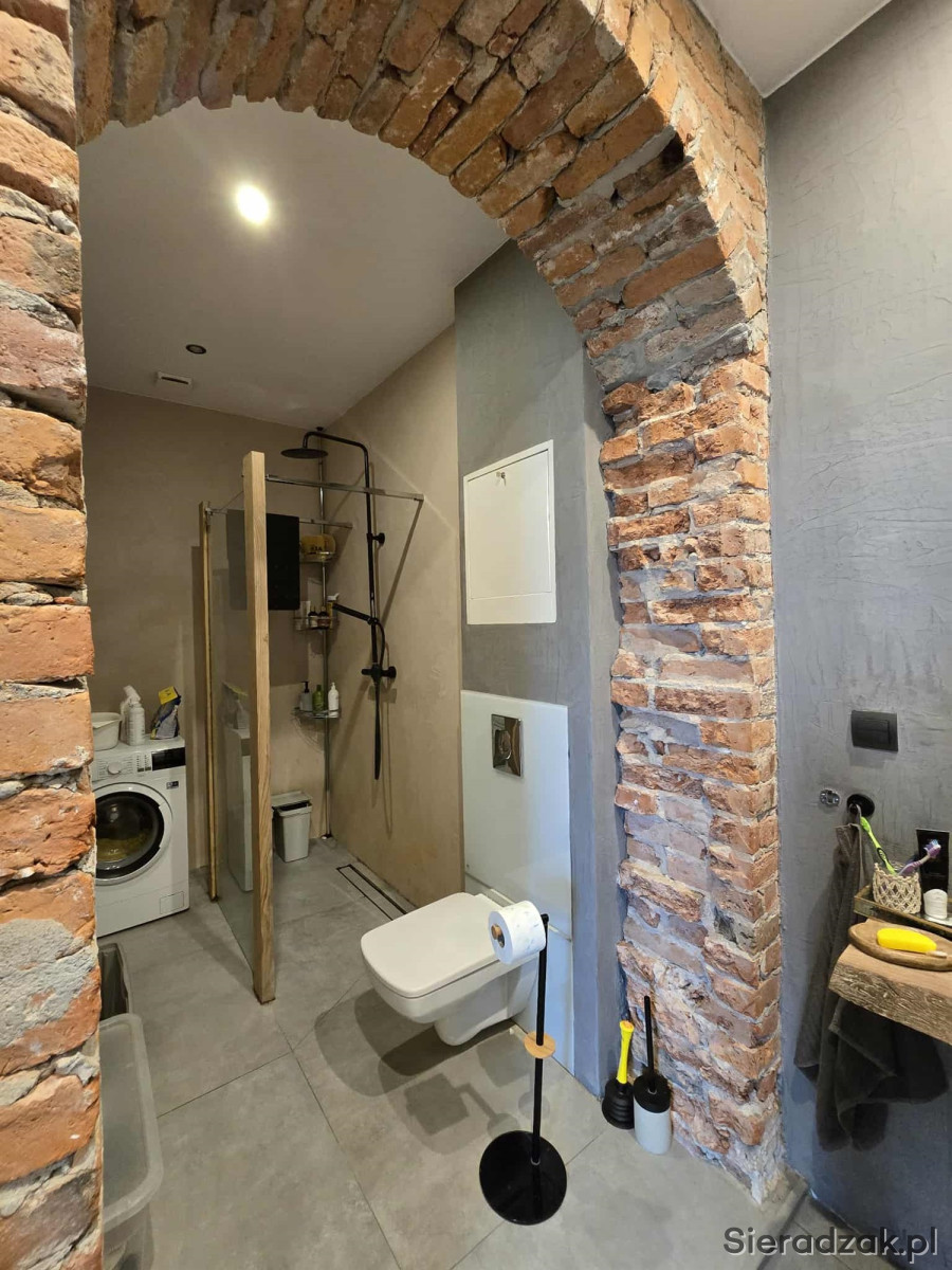 W łazience kabina prysznicowa, kompakt WC, funkcjonalne szafki, lustro, pralka, szafka z umywalką. Wszystko pozostaje w cenie mieszkania.