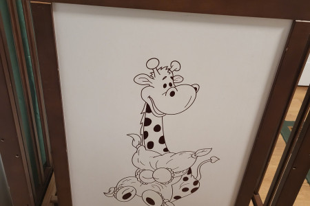 Łóżeczko z motywem żyrafy, posiada szufladę oraz niewielkie ślady użytkowania.