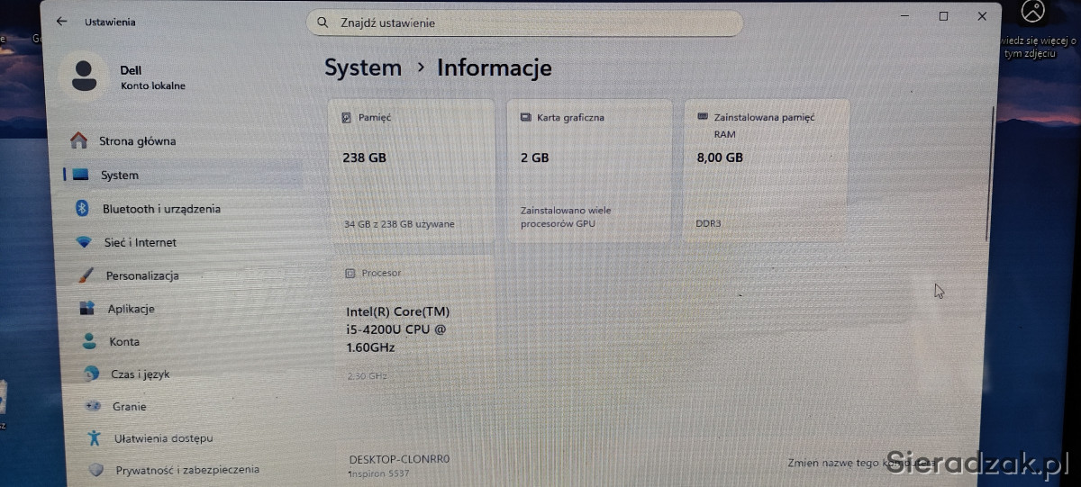 Sprzedam w pełni sprawny laptop Dell Inspiron 5537 . Sprzęt w super stanie posiada procesor 4 rdzeniowy INTEL I5 nowy dysk ssd GOODRAM CX400 256GB oraz 8gb pamieci ram. Obudowa laptopa wykonana z aluminium.