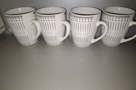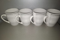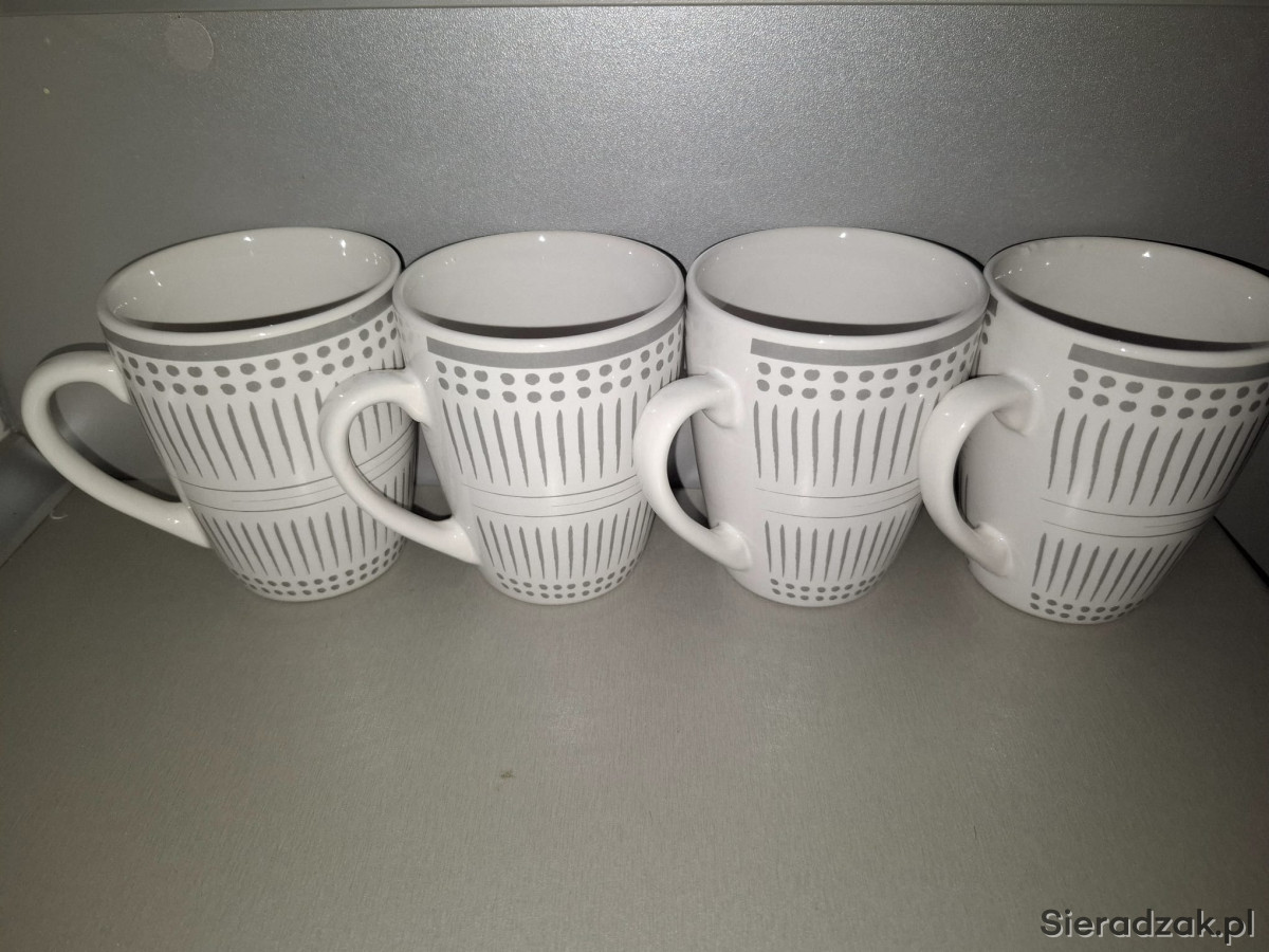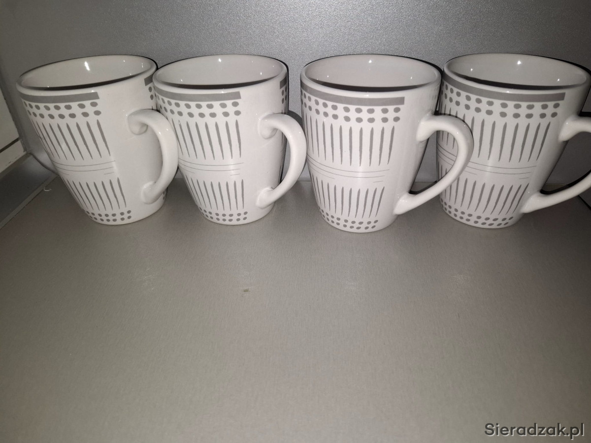 Zestaw 4 nowych kubków z geometrycznym wzorem w kolorze białym i szarym. Kubki mają pojemność około 300 ml i są wykonane z wysokiej jakości porcelany, co gwarantuje trwałość i wytrzymałość. Idealne na codzienne użytkowanie lub jako praktyczny dodatek do kuchni.