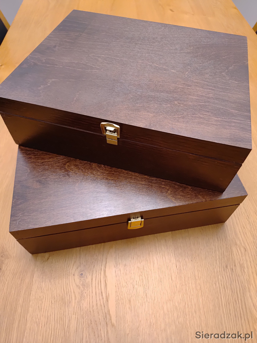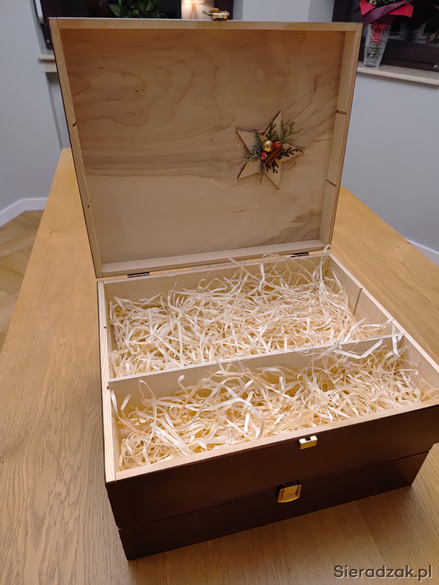 Drewniane pudełka na świąteczne prezenty. Na zewnątrz majonezowy brąz, wewnątrz drewno sosnowe i drewniane wióry. Stan idealny. Polecam
