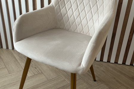 Bardzo wygodne i eleganckie krzesło w kolorze jasnego beżu ze złotymi nogami. Może być do burka jak i do toaletki. Polecam