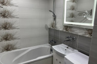 Łazienka wyposażona w wanne umywalkę i pralkę.