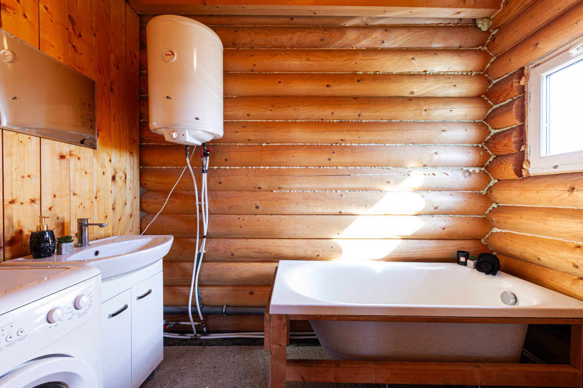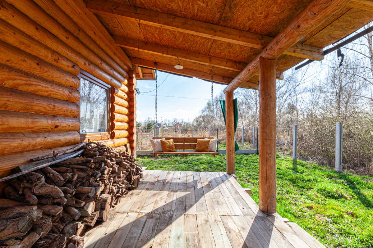 Dom z bala świerkowego ma powierzchnię zabudowy 33,64 mkw. Dach wykonany z blachy.