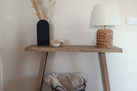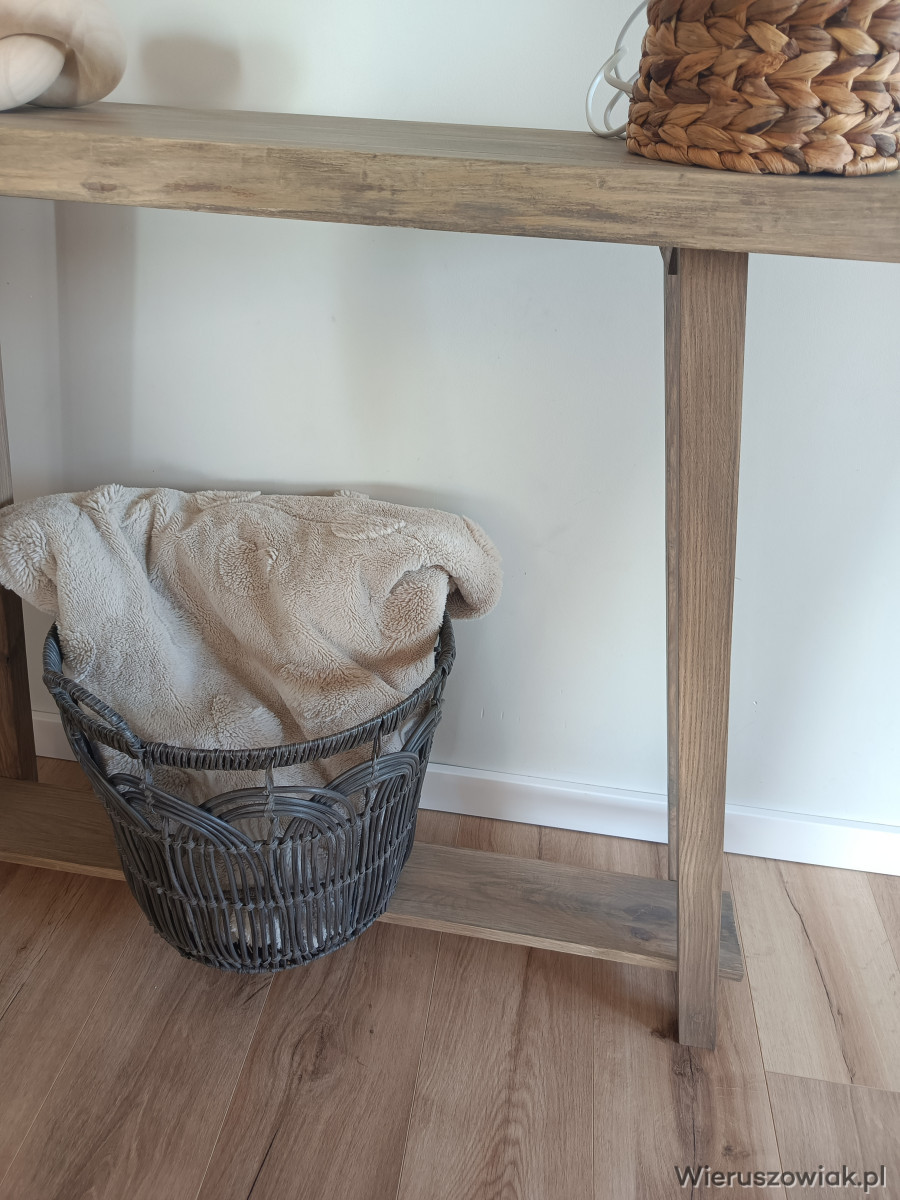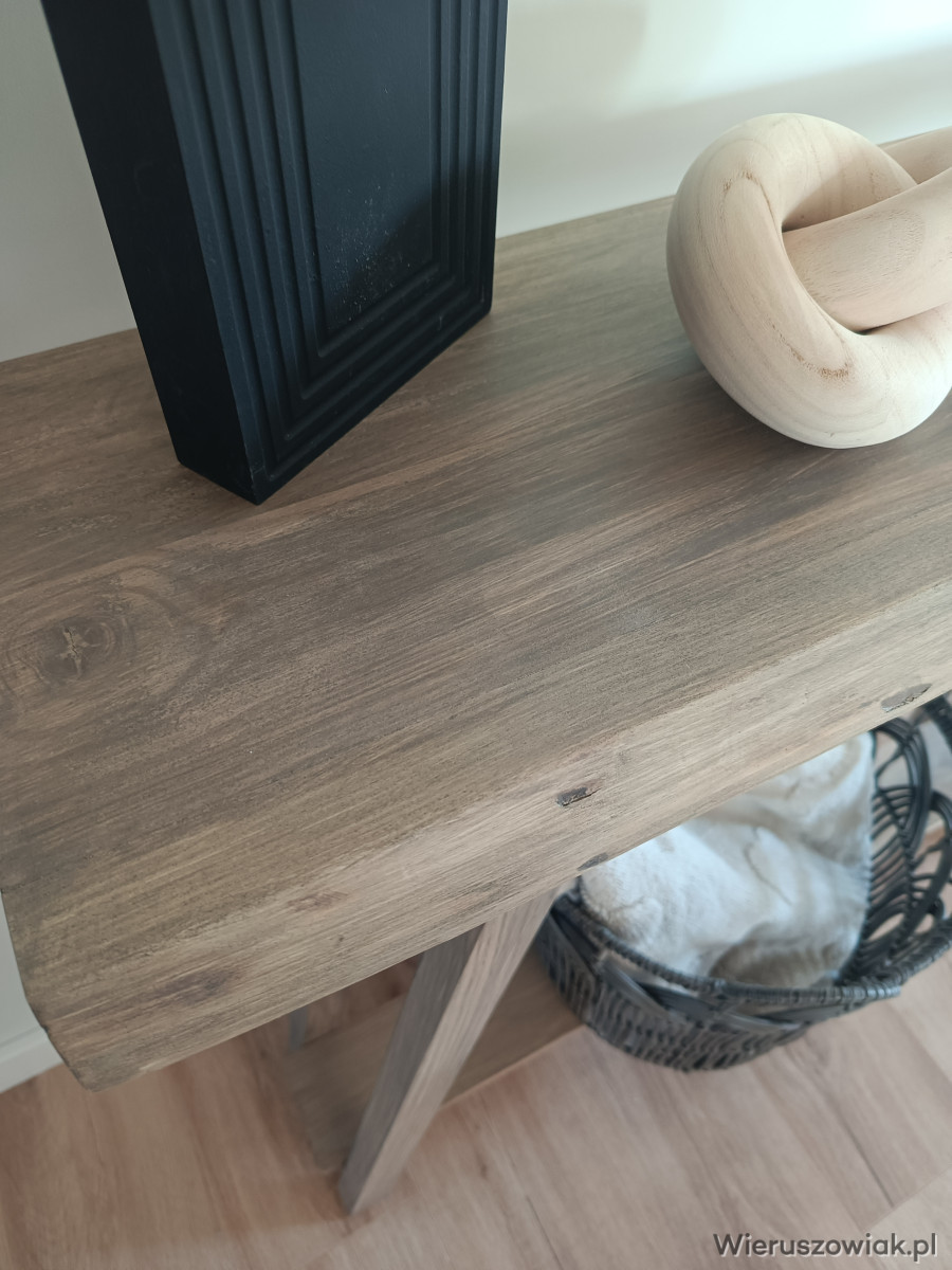 Sprzedam drewniana konsolę. Konsola jest nowa, zabejcowana. Do sprzedania jest wyłącznie konsola, inne elementy na zdjęciu nie podlegają sprzedaży. Wymiary: 1 m wysokość, długość 1 m, głębokość 25 cm