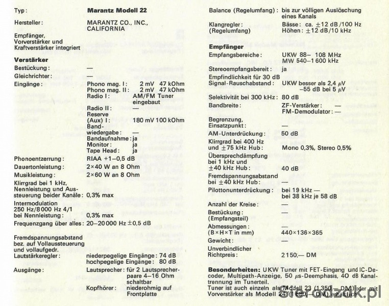 Manufacturer: Marantz Model: 22 (twenty two) Type: Receiver Years of manufacture: 1969 - 1973 Made in: USA Color: silver, wooden cabinet optional Remote control: no Power consumption: 220 W (max), 33 W (idle) Dimensions: 440 x 136 x 365 mm (WxHxD) Weight: approx. 17 kg Original price approx.: 2'150 DM (1970)