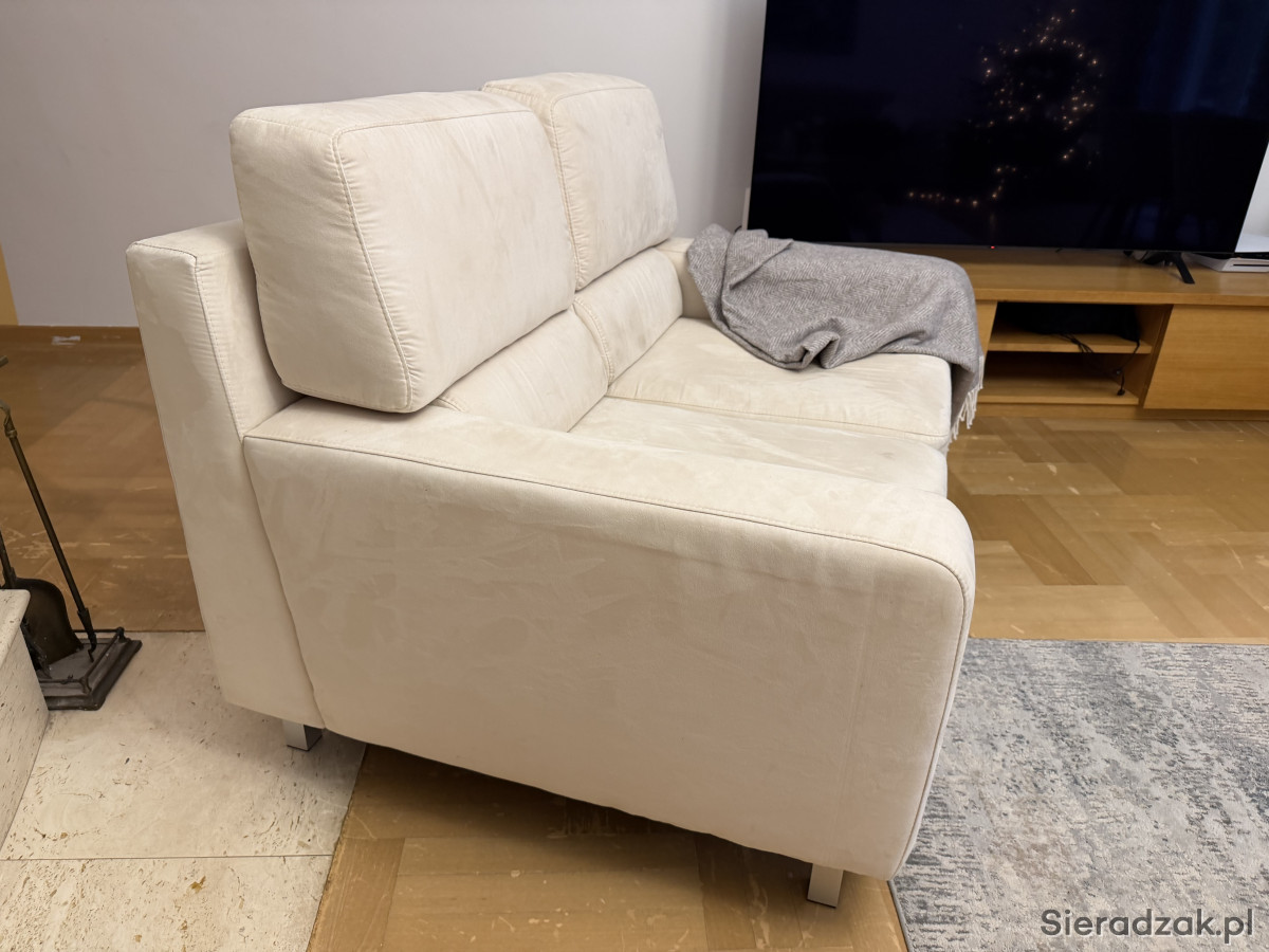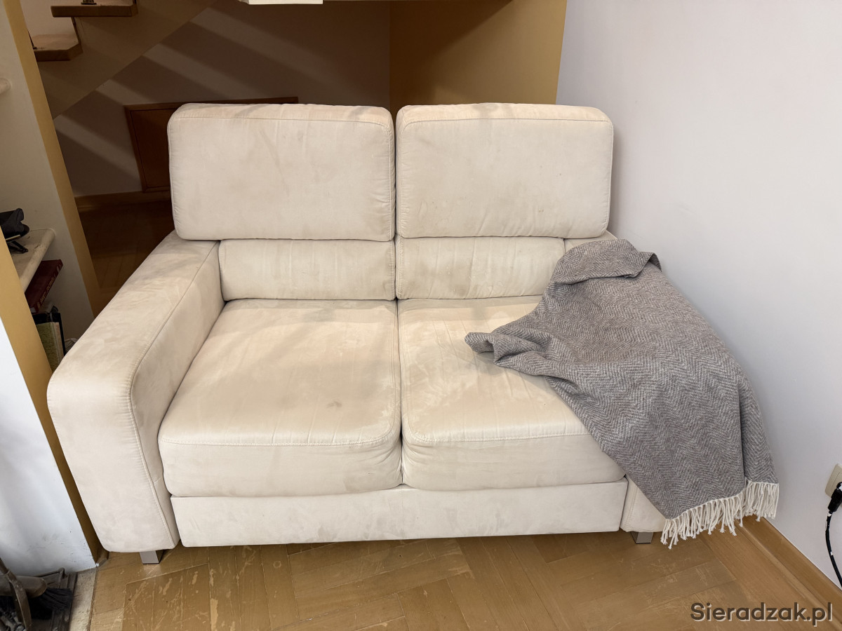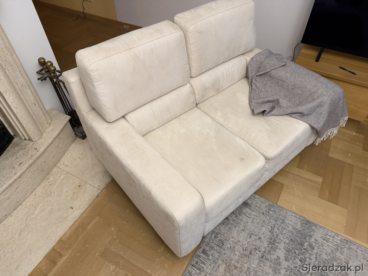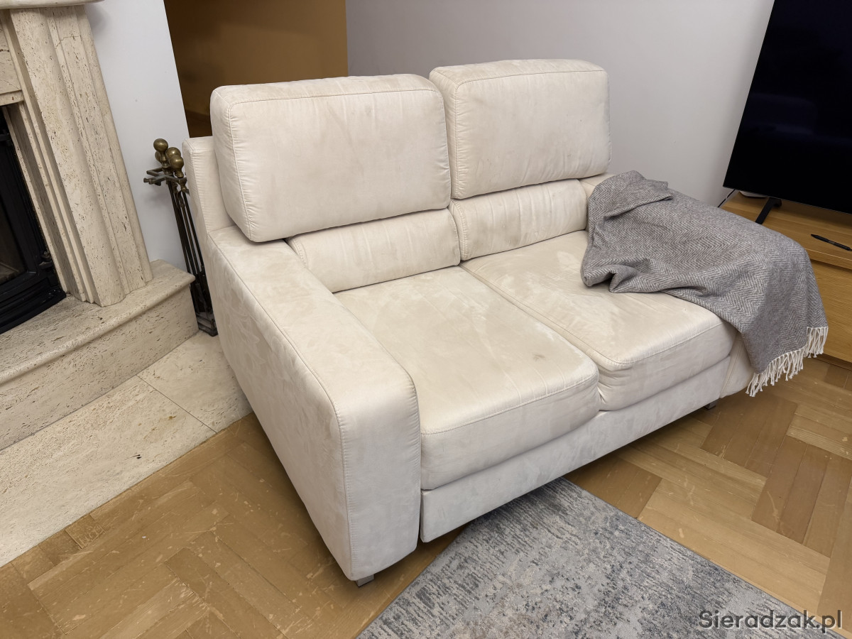 Wygodna, dwuosobowa sofa w kolorze kremowej skóry naturalnej zamszowej oraz fotel rozkładany z tego samego kompletu. Meble używane ale w dobrym stanie. Prane wiosną chemicznie. Idealnie sprawdzi się jako wygodne miejsce do odpoczynku w Twoim salonie. Mebel się rozkłada i można spać zarówno na sofie jak i fotelu.