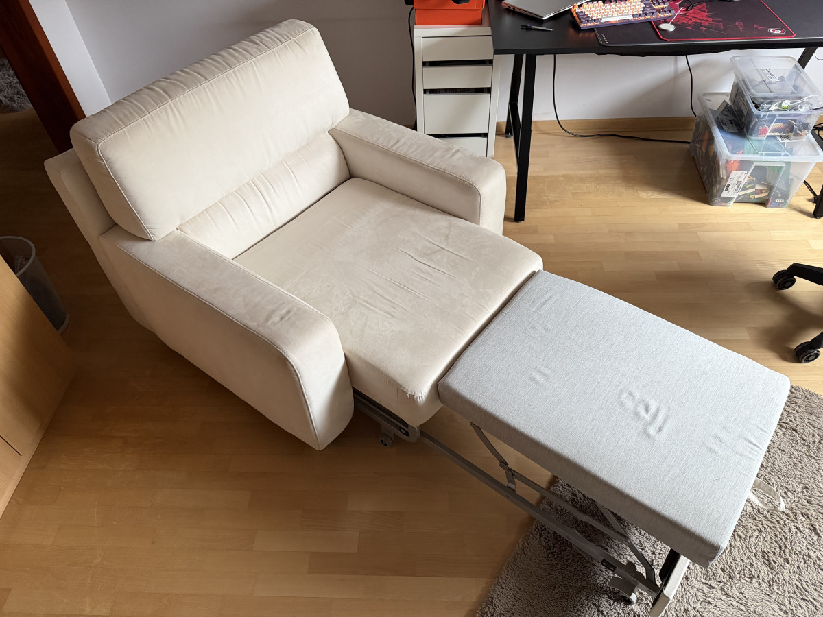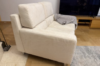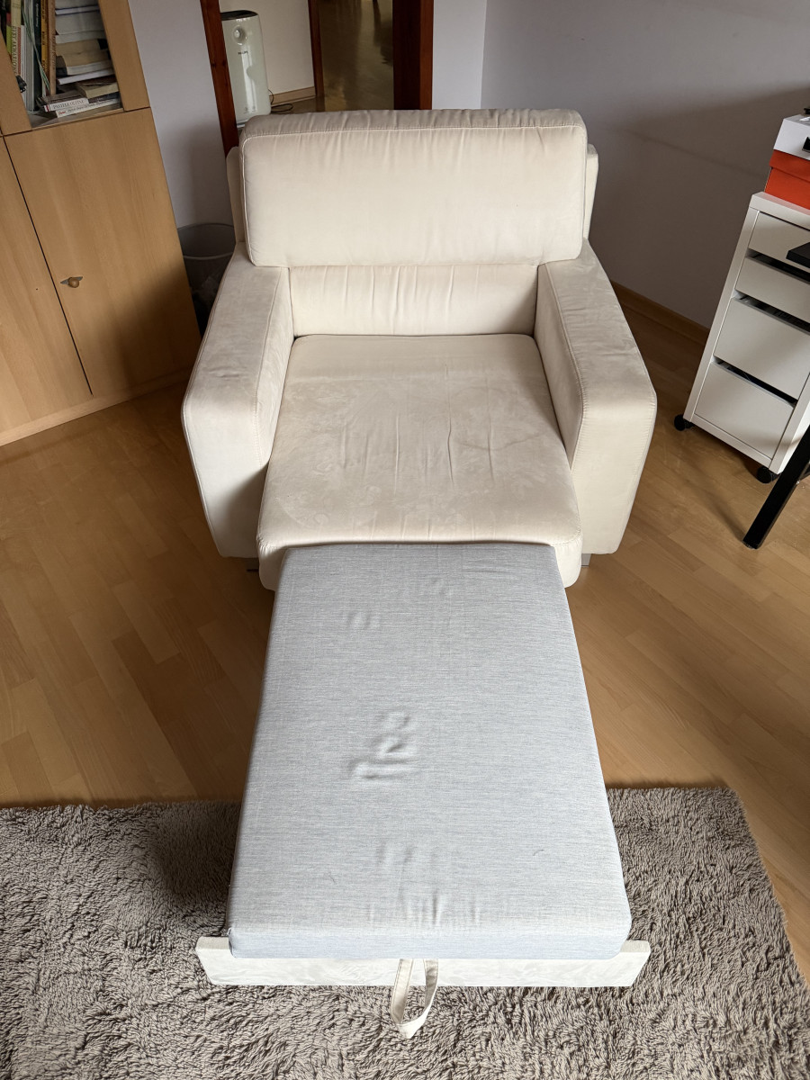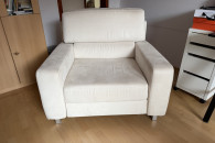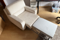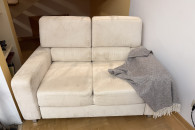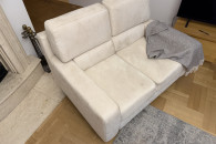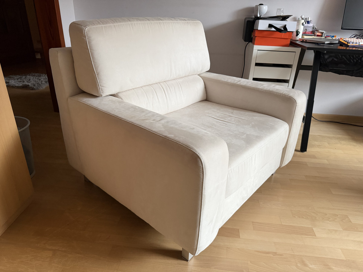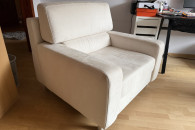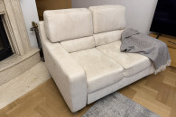 Wygodna, dwuosobowa sofa w kolorze kremowej skóry naturalnej zamszowej oraz fotel rozkładany z tego samego kompletu. Meble używane ale w dobrym stanie. Prane wiosną chemicznie. Idealnie sprawdzi się jako wygodne miejsce do odpoczynku w Twoim salonie. Mebel się rozkłada i można spać zarówno na sofie jak i fotelu.