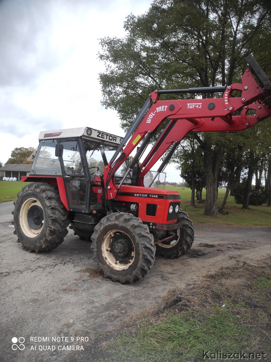Witam mam do sprzedania ciągnik Zetor 7245 z nowym ładowaczem czołowym. Założone nowe opony przód i tył, nowe felgi, zregenerowany przedni most, nowe głowice, nowe błotniki, komplet zaczepów, nowy alternator, rozrusznik, pompa wody, oświetlenie, doinwestowany zapraszam do oględzin