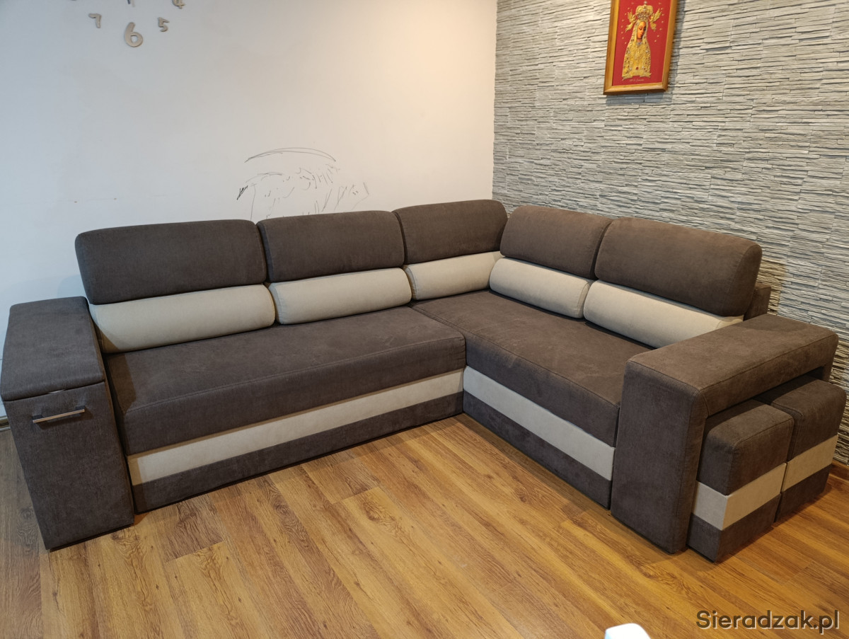 Wygodna, narożna sofa z funkcją spania. Mebel w kolorze brązowym z jasnymi wstawkami, wykonany z trwałych materiałów. Idealna do salonu lub sypialni, zapewniająca komfort i dodatkowe miejsce do spania. Stan bardzo dobry. W narożniku są dwa pojemniki, barek plus dwie pufy.