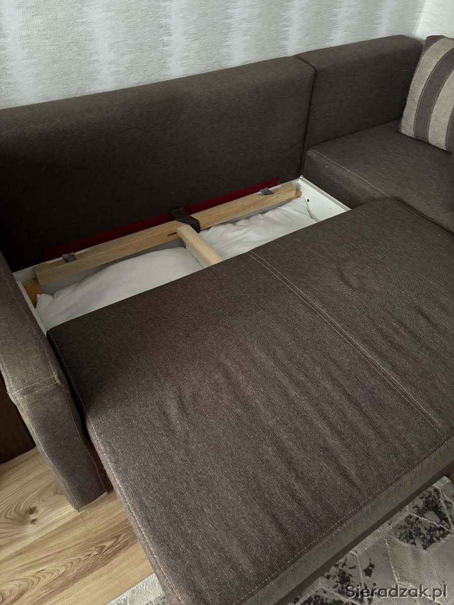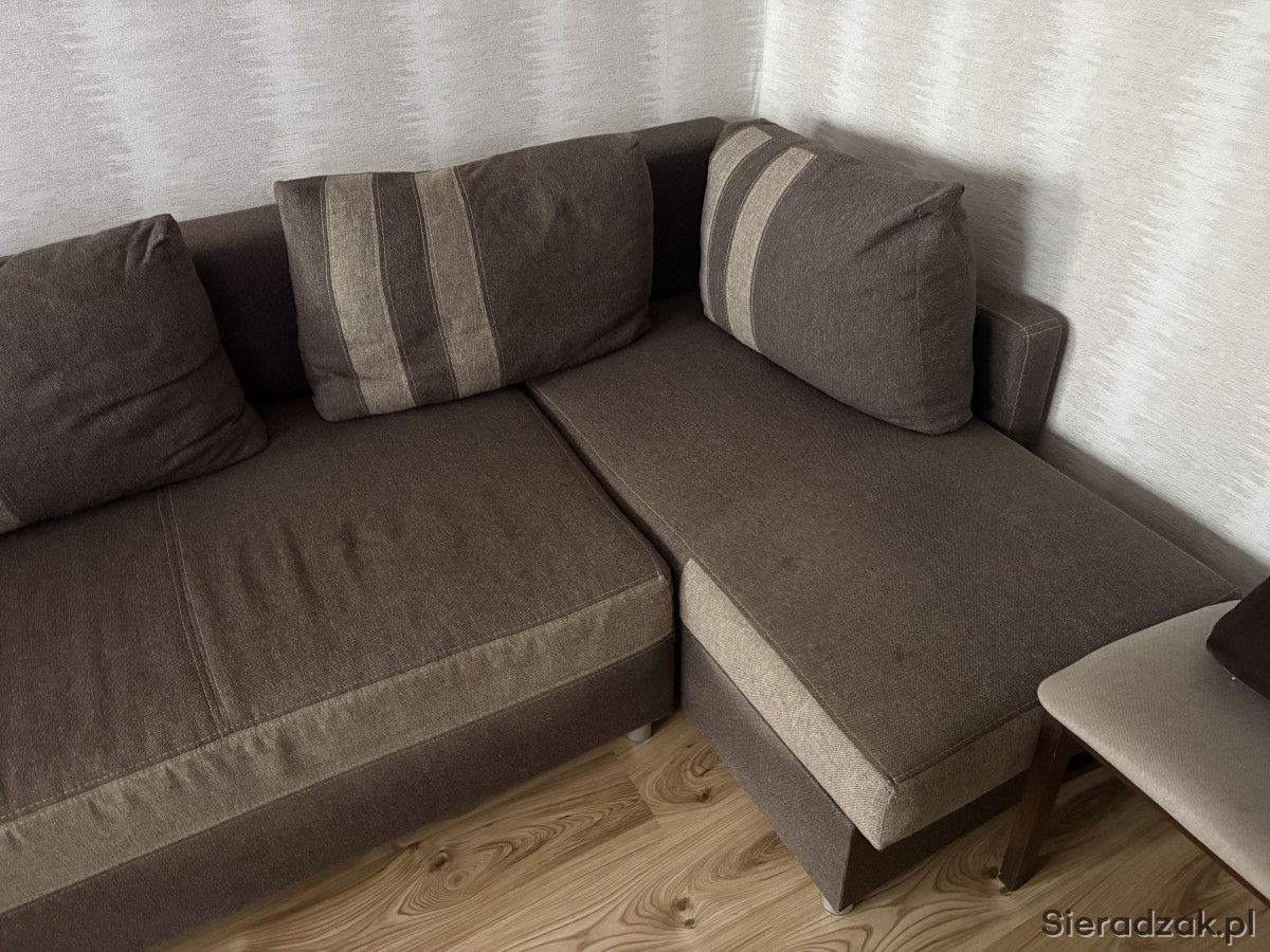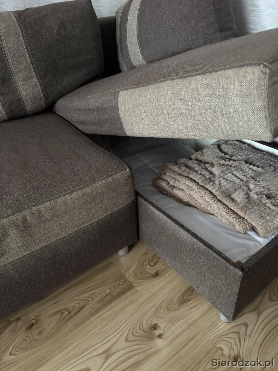 Sprzedam narożnik z funkcją spania i pojemnikiem na pościel. Wymiary: szerokość ok. 220 cm, głębokość ok. 145 cm, wysokość ok. 74 cm.
