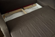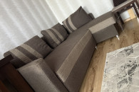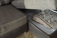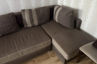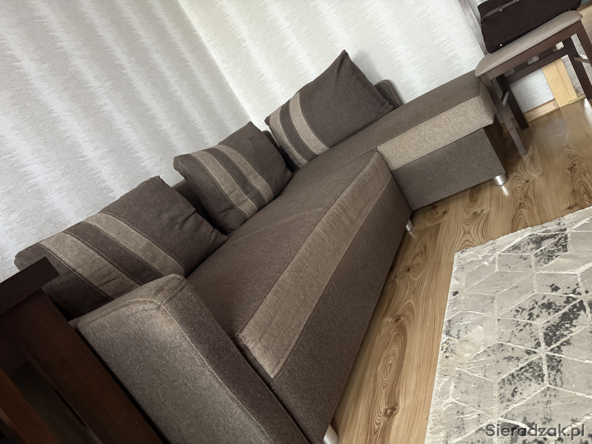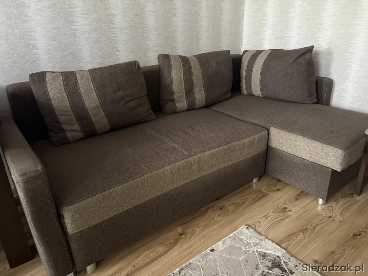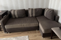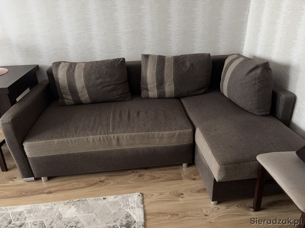 Sprzedam narożnik z funkcją spania i pojemnikiem na pościel. Wymiary: szerokość ok. 220 cm, głębokość ok. 145 cm, wysokość ok. 74 cm.