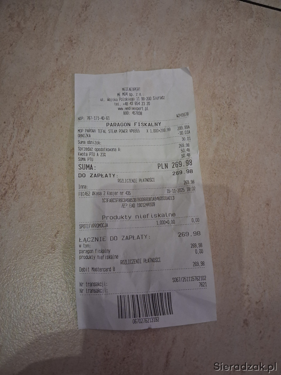 Do sprzedania mop parowy TEFAL STEAM POWER VP6555 zakupiony 15.11.2025 sprawny