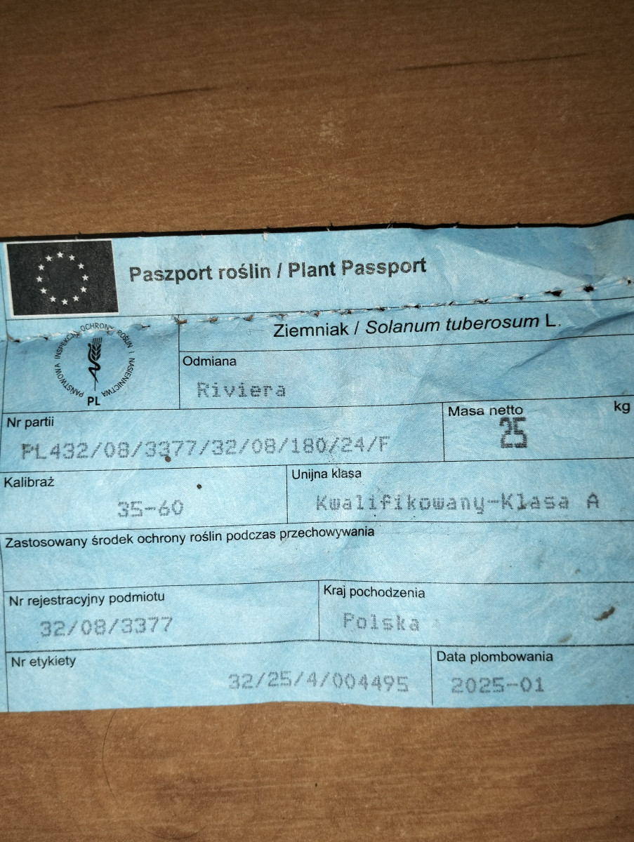 Sprzedam ziemniaki sadzeniaki Riviera kal 3,5-5cm wysadzone z kwalifiaktu klasy A zdrowe opakowanie do uzgodnienia faktura zakupu do wglądu