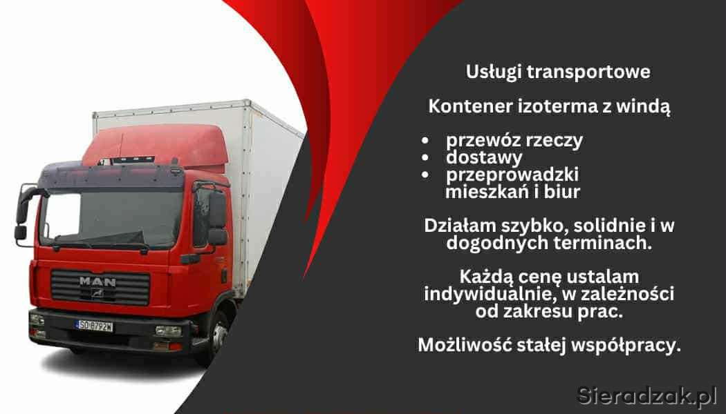 Witam. Posiadam samochód marki MAN TGL kontener z windą. Oferuję usługi transportowe między innymi przeprowadzki , dostawy , przewóz rzeczy ,palety itd. Ładowność samochodu do 12 ton. Również możliwość wynajęcia samochodu.