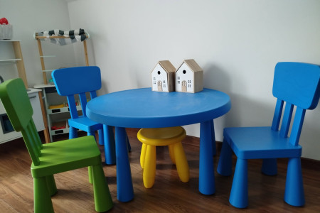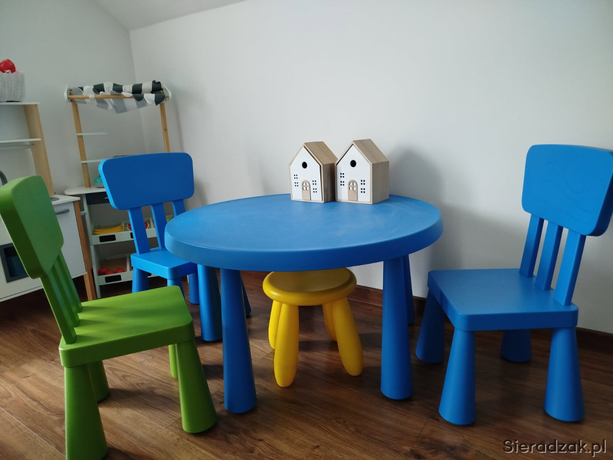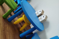 Zestaw składający się ze stołu oraz trzech krzeseł i taboretu w kolorach niebieskim, zielonym i żółtym, pochodzący z marki IKEA. Idealny do urządzenia kącika zabaw dla dzieci w domu lub przedszkolu.