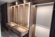 Nowoczesna, podświetlana i bardzo pojemna szafa o wysokości 2,5 m, szerokości 3,5 m i głębokości 78 cm. Posiada podświetlenie, które nadaje jej stylowy wygląd. Idealna do przechowywania ubrań i innych przedmiotów w dużej przestrzeni. Wąska półka na końcu pozwala przechowywać np. deskę do prasowania bez konieczności chowania jej za, i obawy, że się przewróci. Automatyczne światła LED zamontowane w każdym drążku oraz obrzeżach doskonale podświetlają zawartość szafy bez konieczności włączania głównego światła. Oświetlenie wyłącza się chwili zamknięcia drzwiczek. Na prezentowanej szafie brak jest jeszcze uchwytów- możesz wybrać takie, które będą Ci najbardziej odpowiadać.