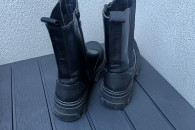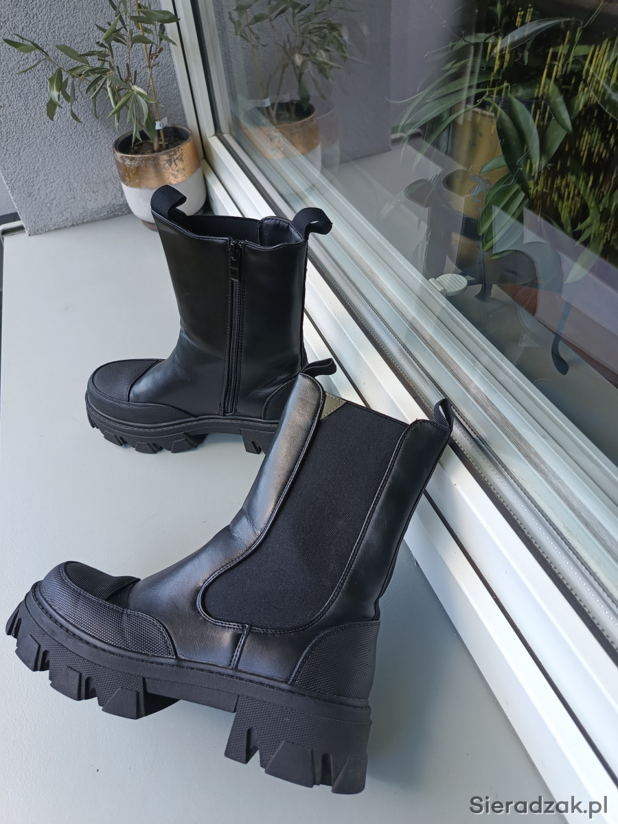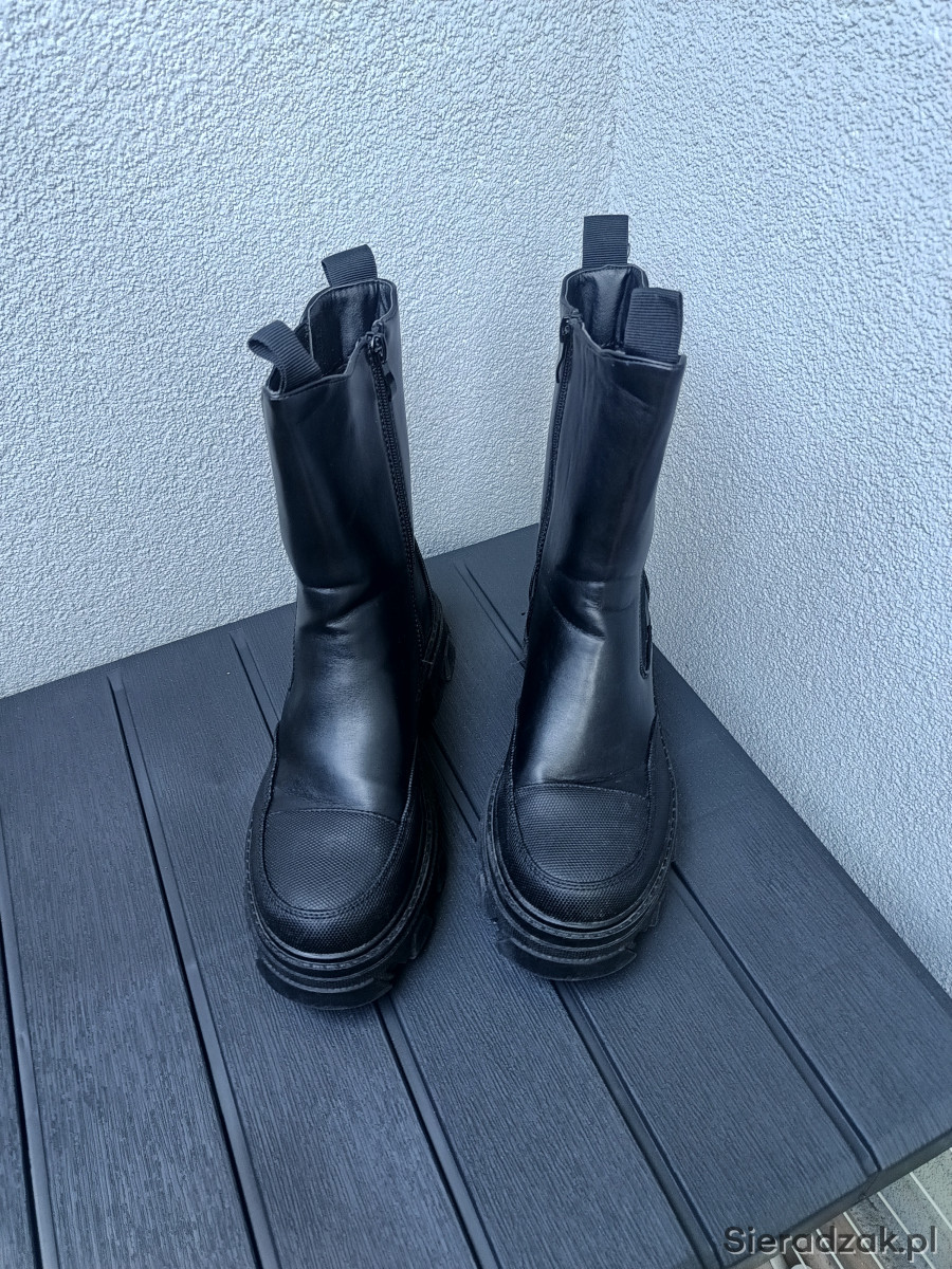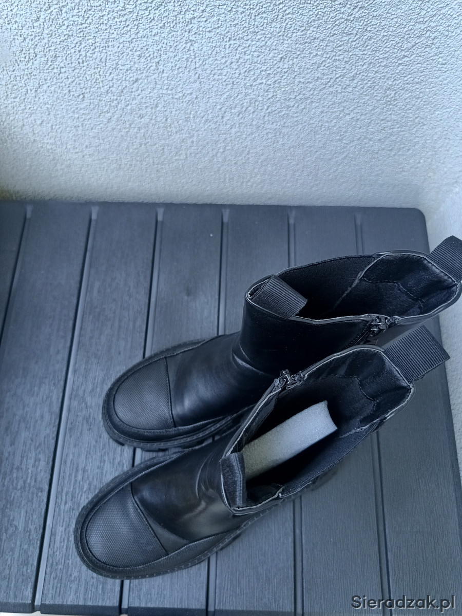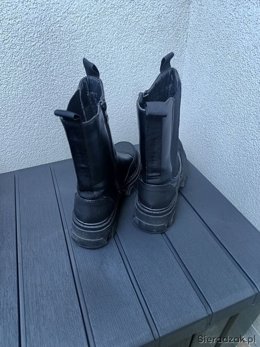 Do sprzedania czarne botki na platformie, rozmiar 39, (25 cm), w środku obłożone cienką okladziną ocieplającą, botki w bardzo dobrym stanie, raz w użyciu. Polecam.