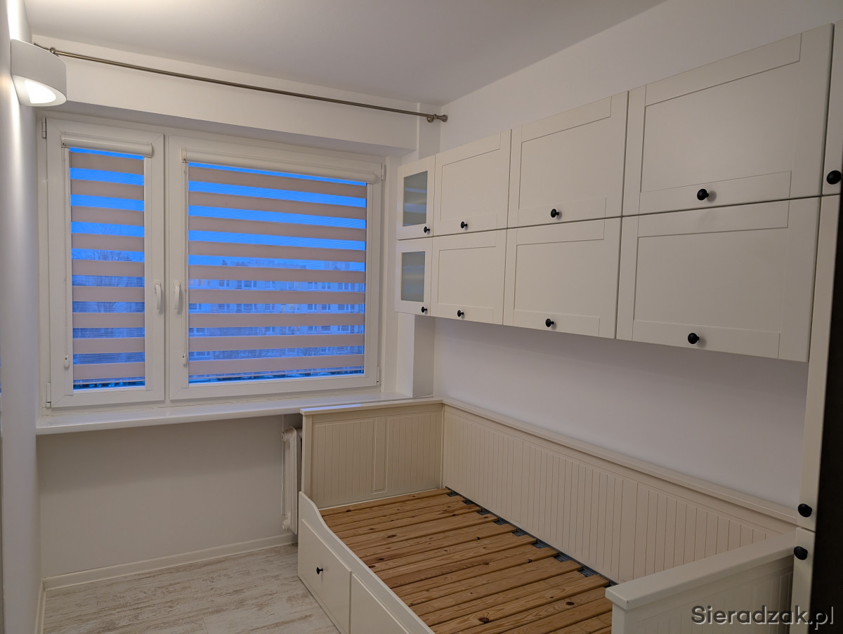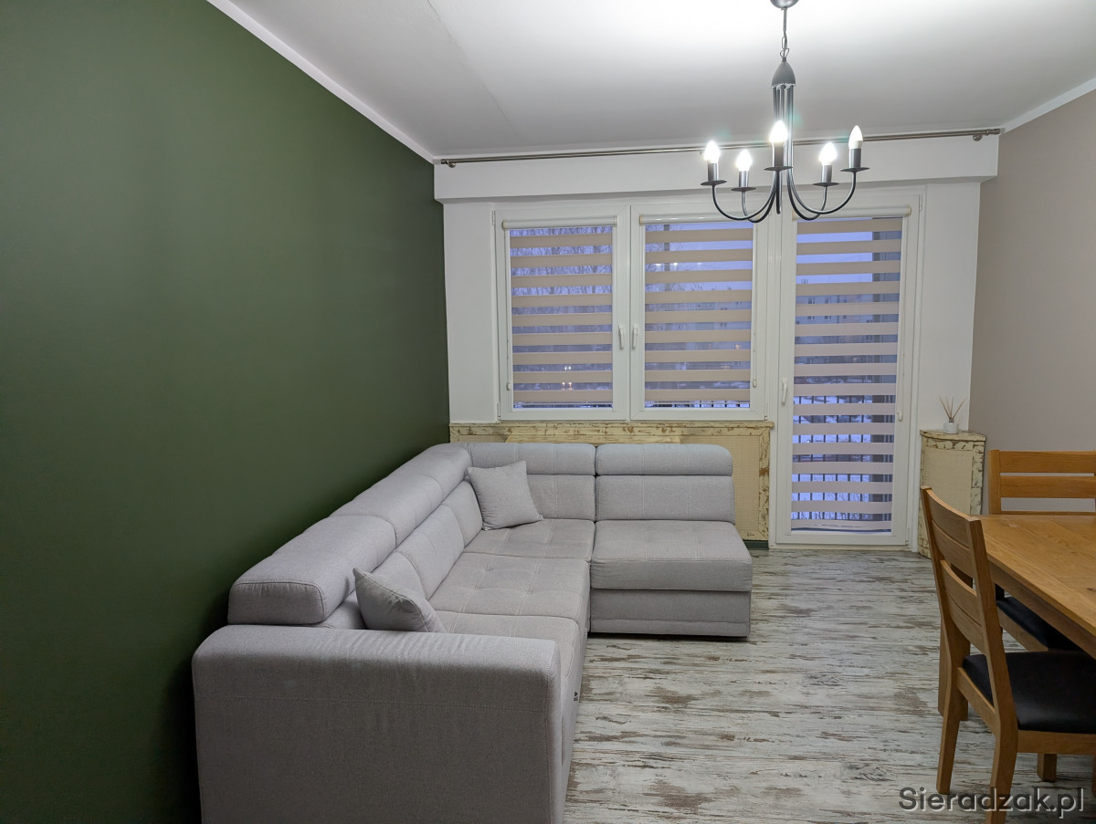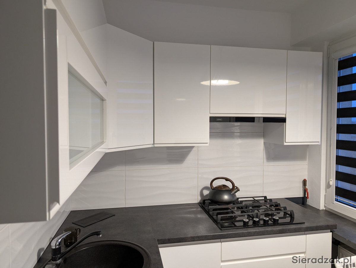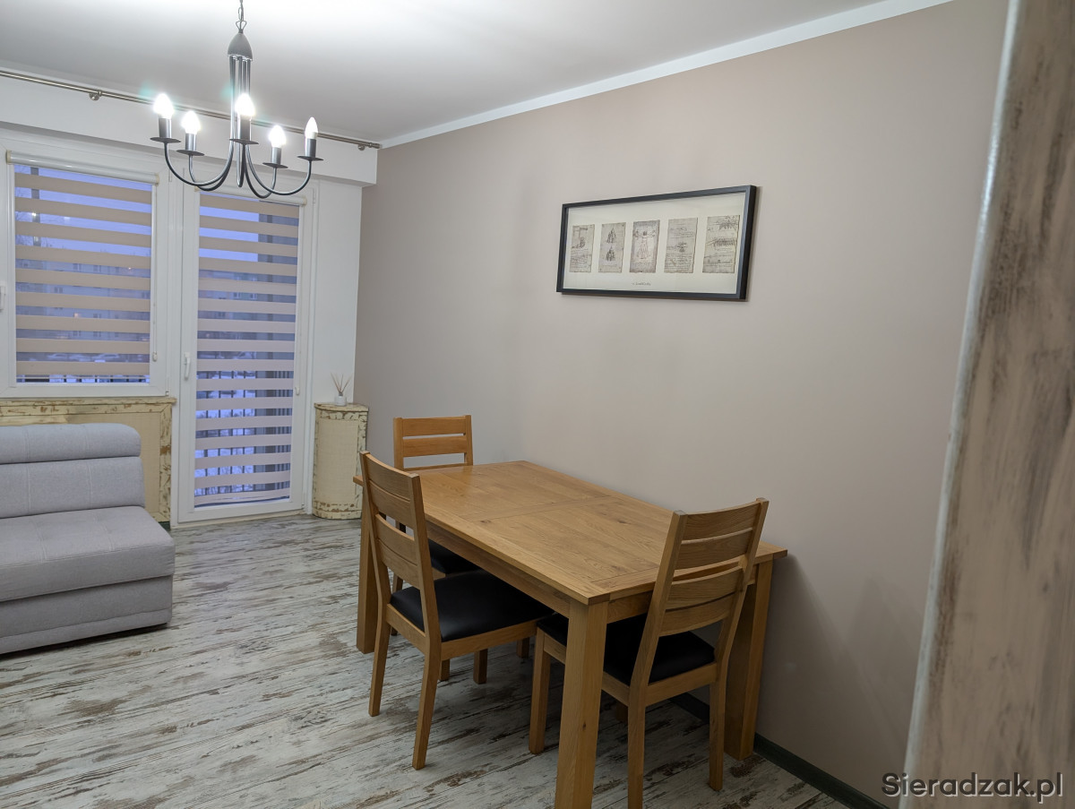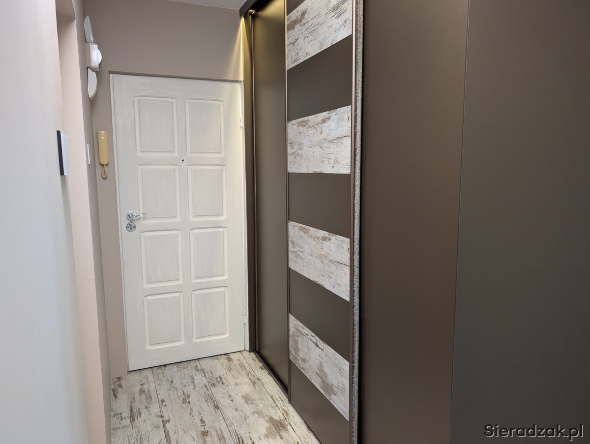 W przedpokoju szafa wnękowa. W dużym pokoju narożnik i stół dębowy z krzesłami. W małym pokoju szafa wnękowa z dużym lustrem oraz łóżko z zabudową z szafek dookoła łóżka. Kuchnia z meblami na wymiar oraz piekarnikiem, zmywarką, lodówką i płytą gazową. Osobna łazienka i WC. W łazience lustro, kabina prysznicowa, pralka, suszarka do ubrań oraz duża szafka. W WC dodatkowa szafka. Mieszkanie posiada również balkon i piwnicę. Ponadto przed blokiem znajduje się duży monitorowany parking.