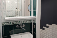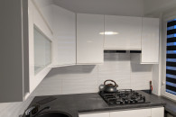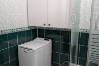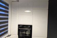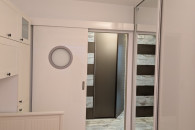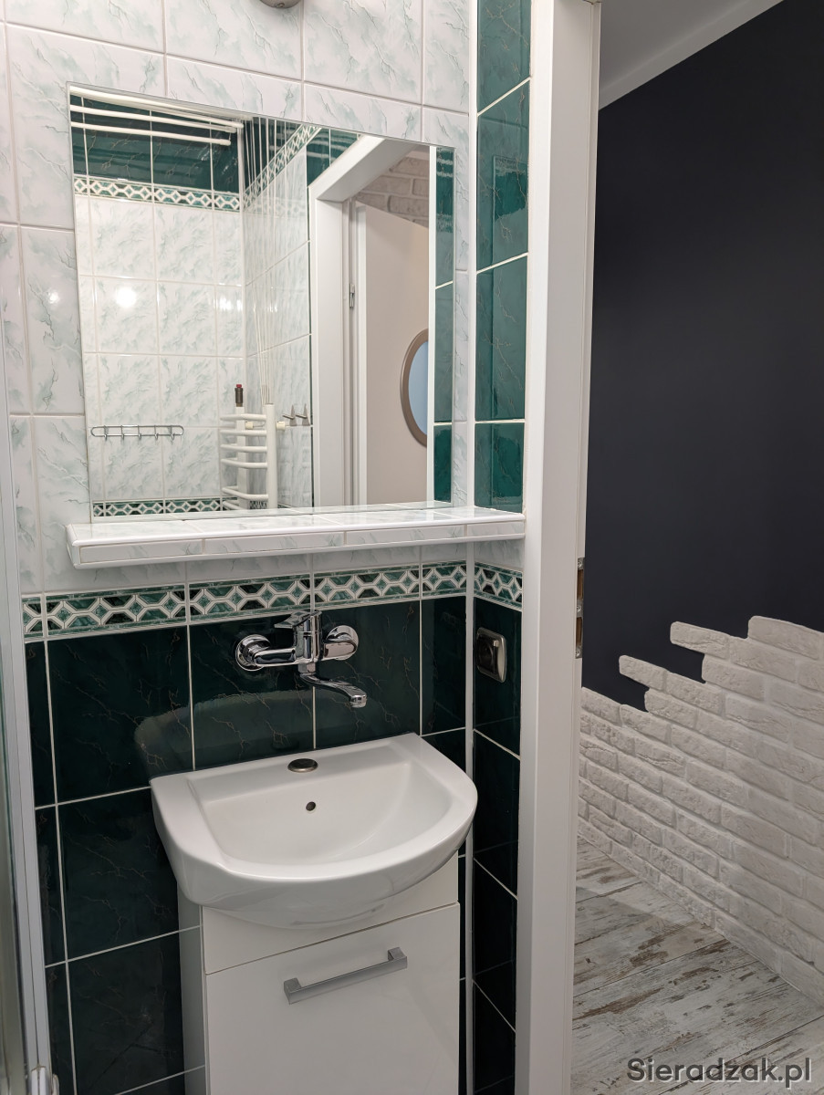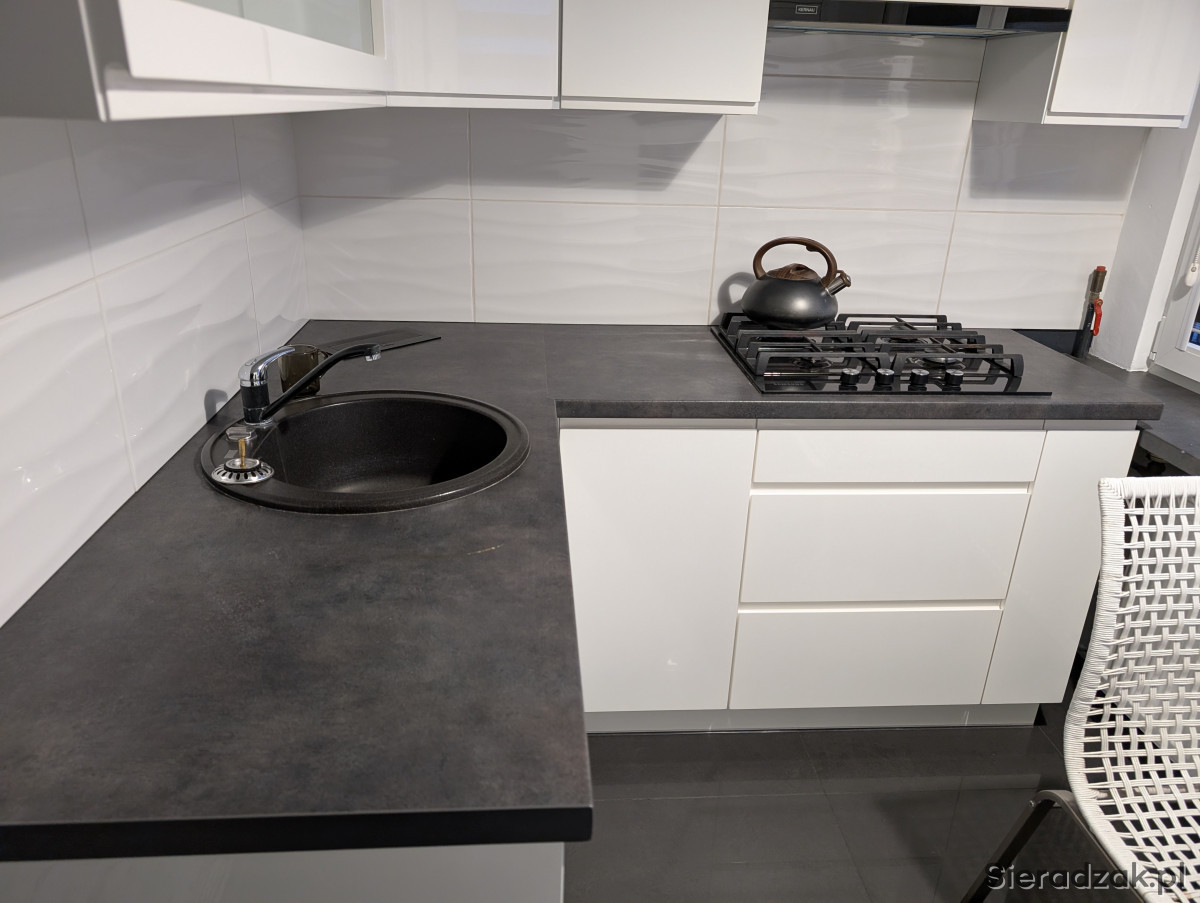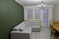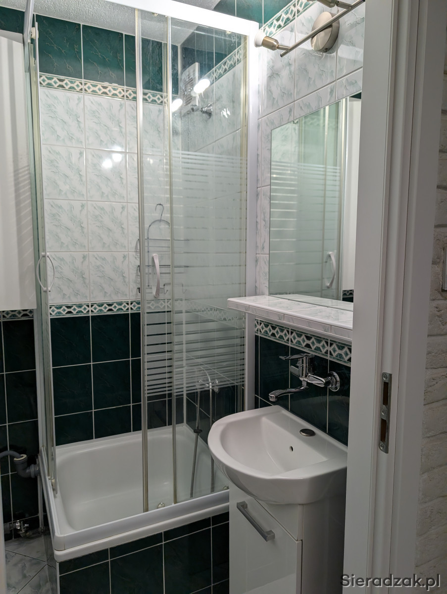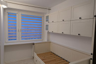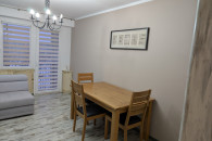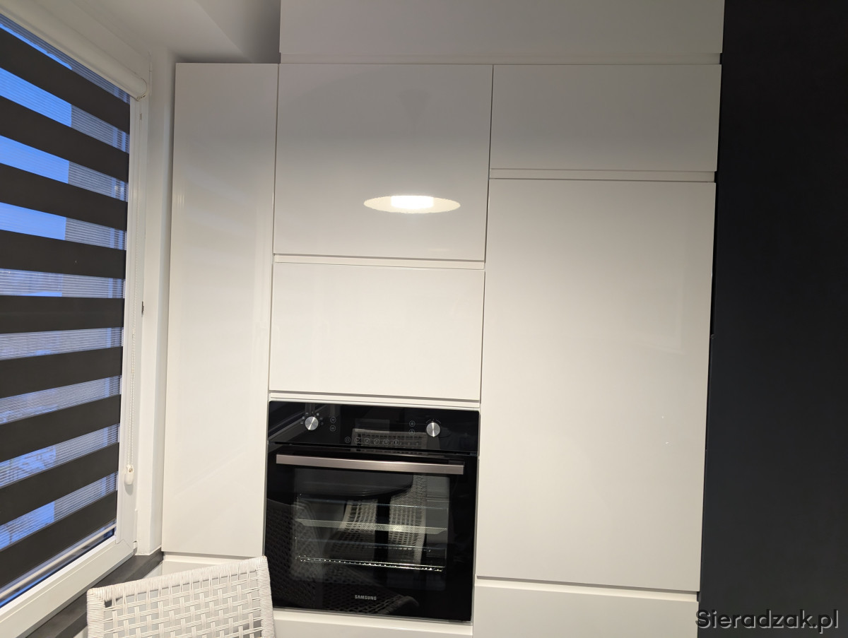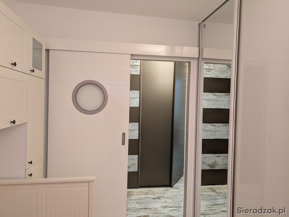 W przedpokoju szafa wnękowa. W dużym pokoju narożnik i stół dębowy z krzesłami. W małym pokoju szafa wnękowa z dużym lustrem oraz łóżko z zabudową z szafek dookoła łóżka. Kuchnia z meblami na wymiar oraz piekarnikiem, zmywarką, lodówką i płytą gazową. Osobna łazienka i WC. W łazience lustro, kabina prysznicowa, pralka, suszarka do ubrań oraz duża szafka. W WC dodatkowa szafka. Mieszkanie posiada również balkon i piwnicę. Ponadto przed blokiem znajduje się duży monitorowany parking.