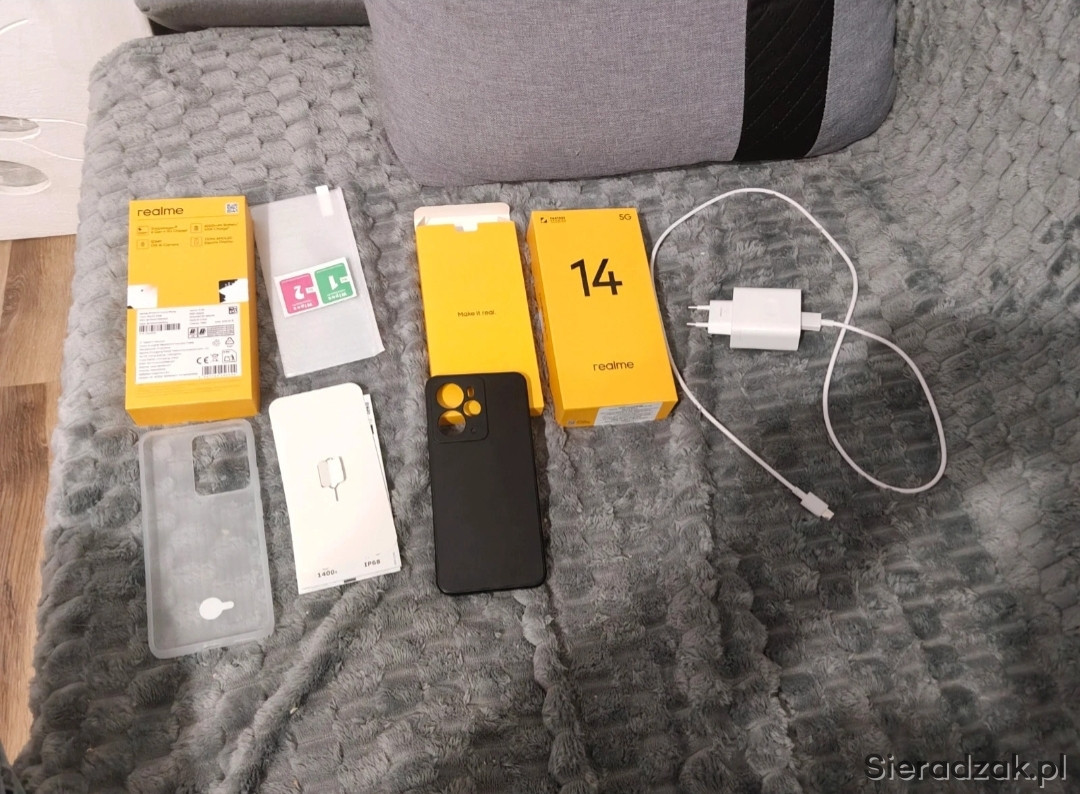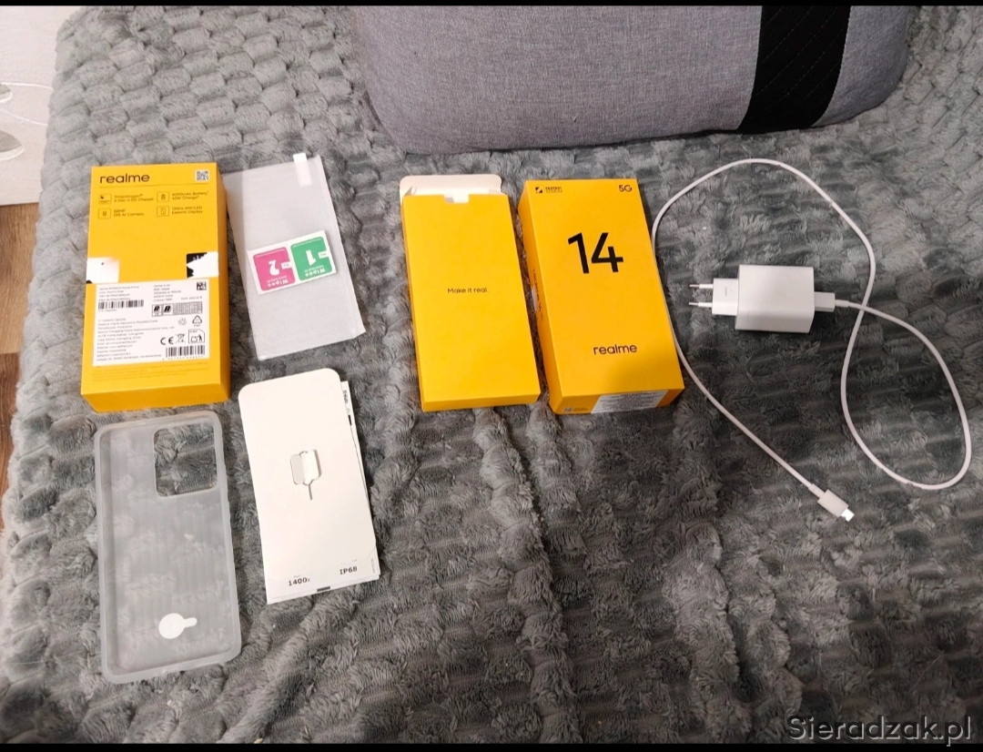 Sprzedam telefon Realme 14 5G 8/265GB. Duża bateria 6000 mAh. W zestawie oryginalna ładowarka realme do szybkiego ładowania, dodatkowo drugie etui i zapasowe szkło ochronne do naklejenia (jedno już jest naklejone). Paragon do telefonu, aktualna gwarancja 2 lata. Telefon używany kilka dni jako zapasowy.