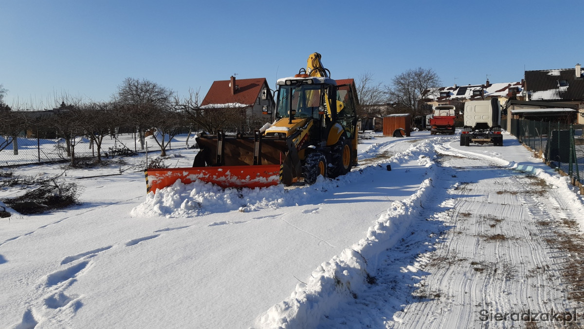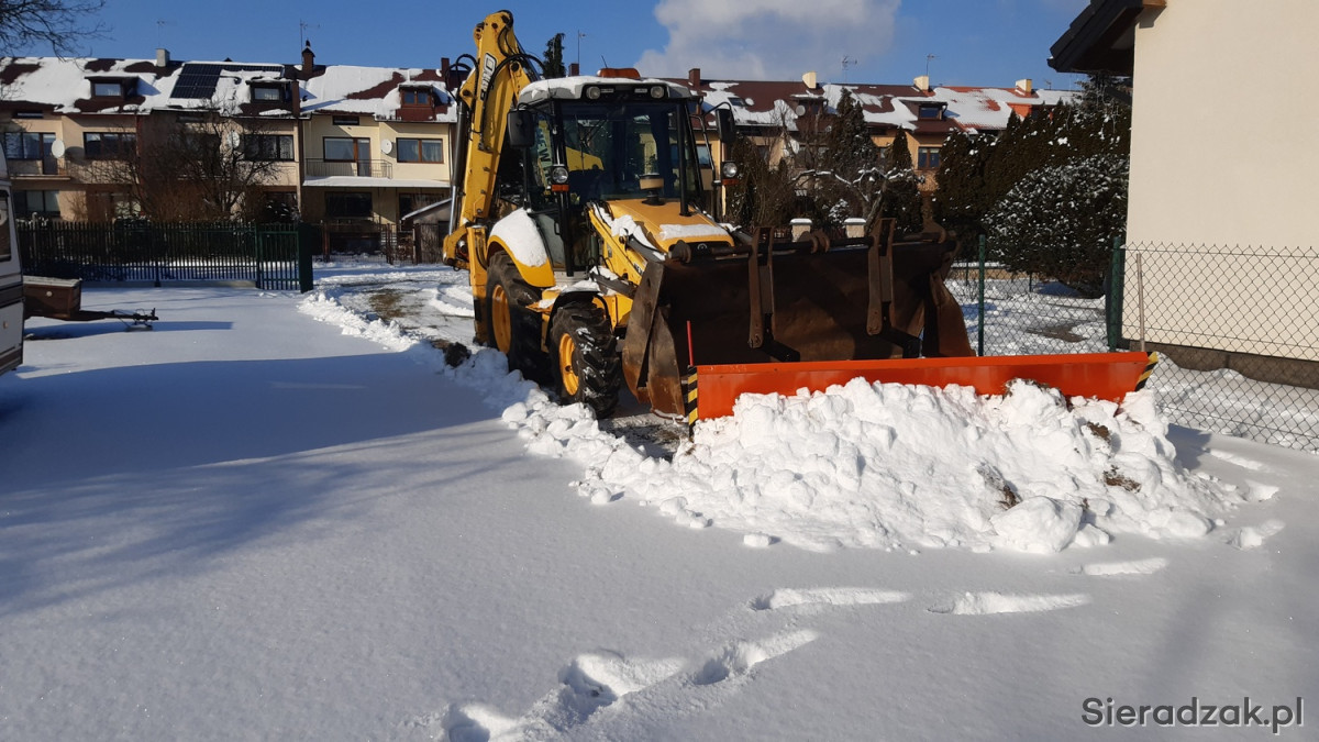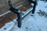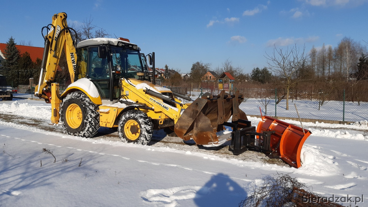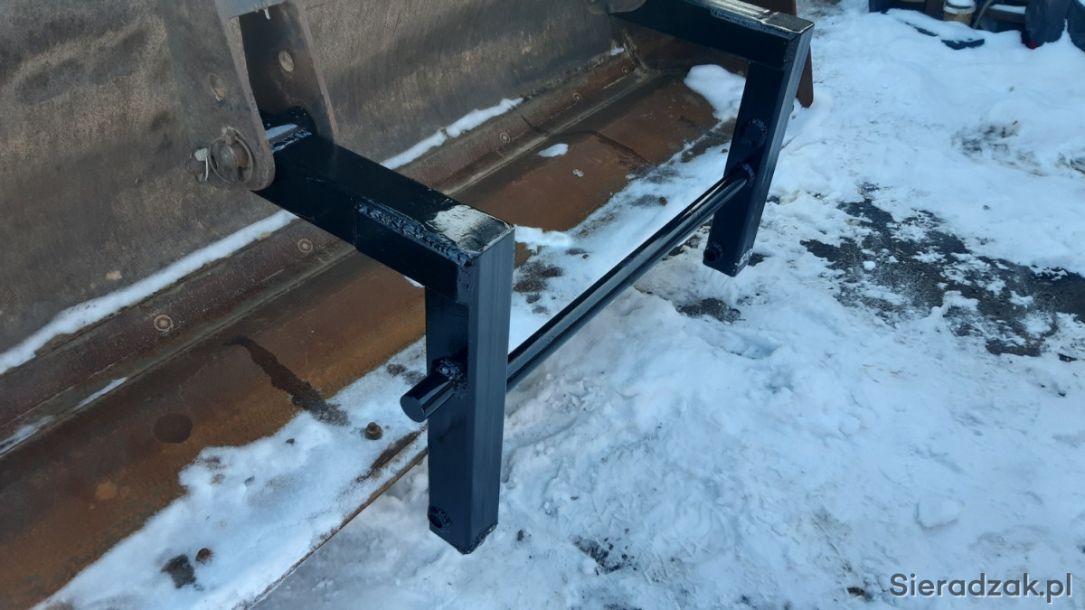 Pług o prostej konstrukcji z ramką do koparko ładowarki New Holland montowany w miejsce wideł.