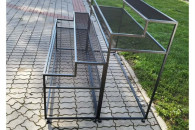 Sprzedam regał wystawowy w kształcie schodów firmy Novbis z Kutna, w kolorze szarym, wykonany z metalowych profili 15x15 i metalowej siatki .