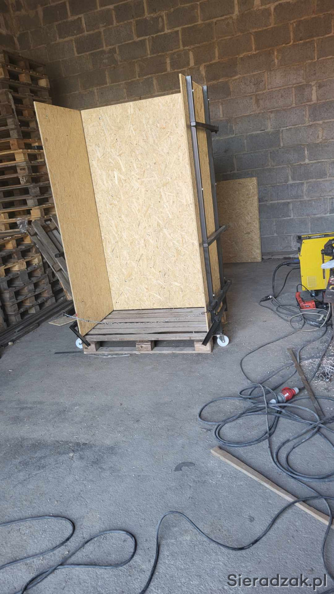 Konstrukcja solidna i stabilna, ściany z płyty OSB, kółka porcelanowe. Konstrukcje można bez problemu załadować na ciężarówkę (rozłoży się cała w linii prostej).