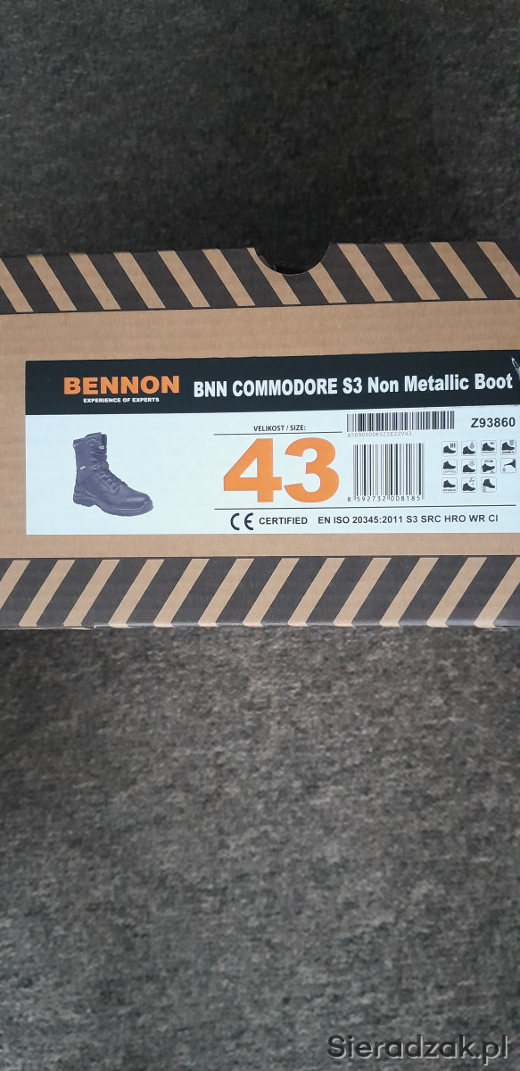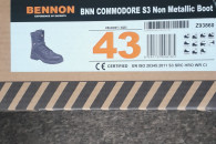Buty całoroczne BENNON COMMODORE S3 bez części metalowych, z kompozytowym podnoskiem i kevlarową stopą. Wierzchnia część butów wykonana została z hydrofobowej skóry licowej Buffalo. Buty wyposażone są w wodoodporną membranę REGI-TEX ® . Anatomiczna wkładka WARRIOR jest trójskładnikowa, z elementem amortyzującym w pięcie. Buty posiadają dwuskładnikową natryskiwaną podeszwę SPARTACUS PU/guma. Podeszwa jest odporna na ciepło kontaktowe do 300°C. Obuwie przeznaczone jest do całorocznego użytkowania w wymagających warunkach terenowych. EN ISO 20345:2011 S3 SRC HRO WR CI.