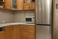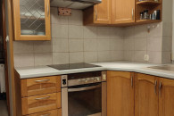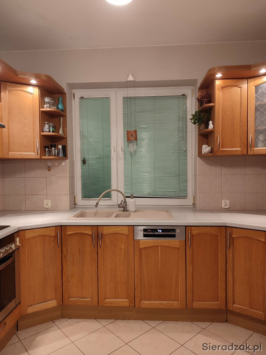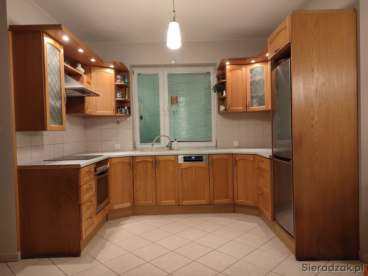 Meble mają fronty wykonane z drewna (dąb). Wysokość 227 cm, dolne szafki wysokość 92 cm; poziome wymiary: 180 cm (lewa strona) / 321 cm (pod oknem) / 200 (prawa strona); blat ma szerokość 61 cm, jest zlicowany z parapetem okiennym i w tej części szerokość wynosi 84 cm.