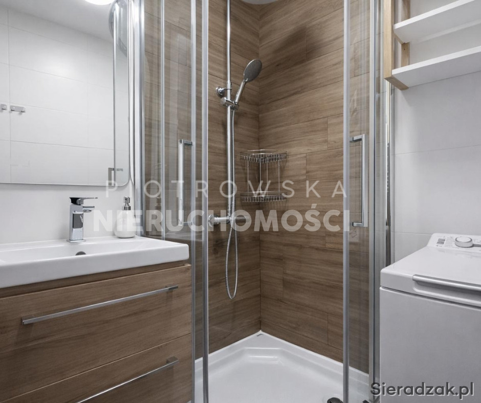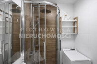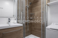 - Łazienka – nowoczesna, z kabiną prysznicową typu walk-in, umywalką z szafką oraz pralką.