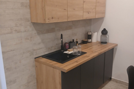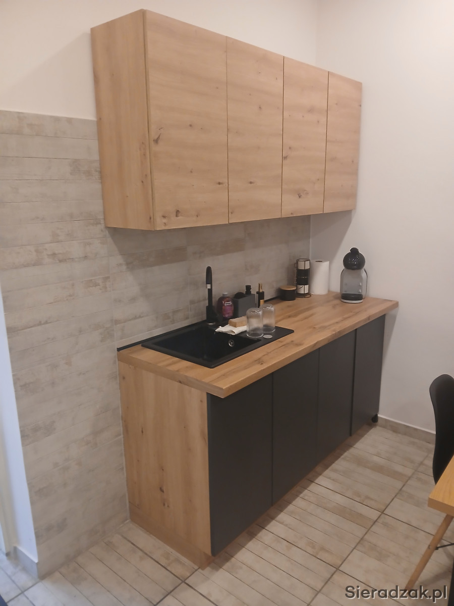 Składa on się z 4 szafek, dwie stojące i dwie wiszące,blat,zlewozmywak z baterią oraz podgrzewacza wody.