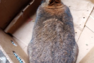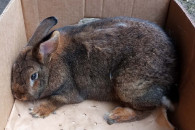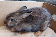 Sprzedam samicę królika domowego (mieszańca) typu mięsnego o umaszczeniu w kolorze odcieni brązu, szarości i czerni z białymi akcentami na spodzie i łapach