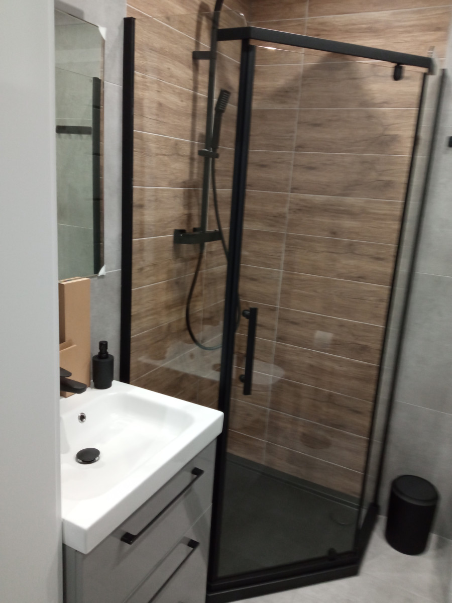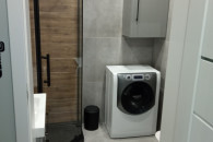 Łazienka wyposażona jest w kabinę prysznicową, umywalkę, toaletę, pralkę.