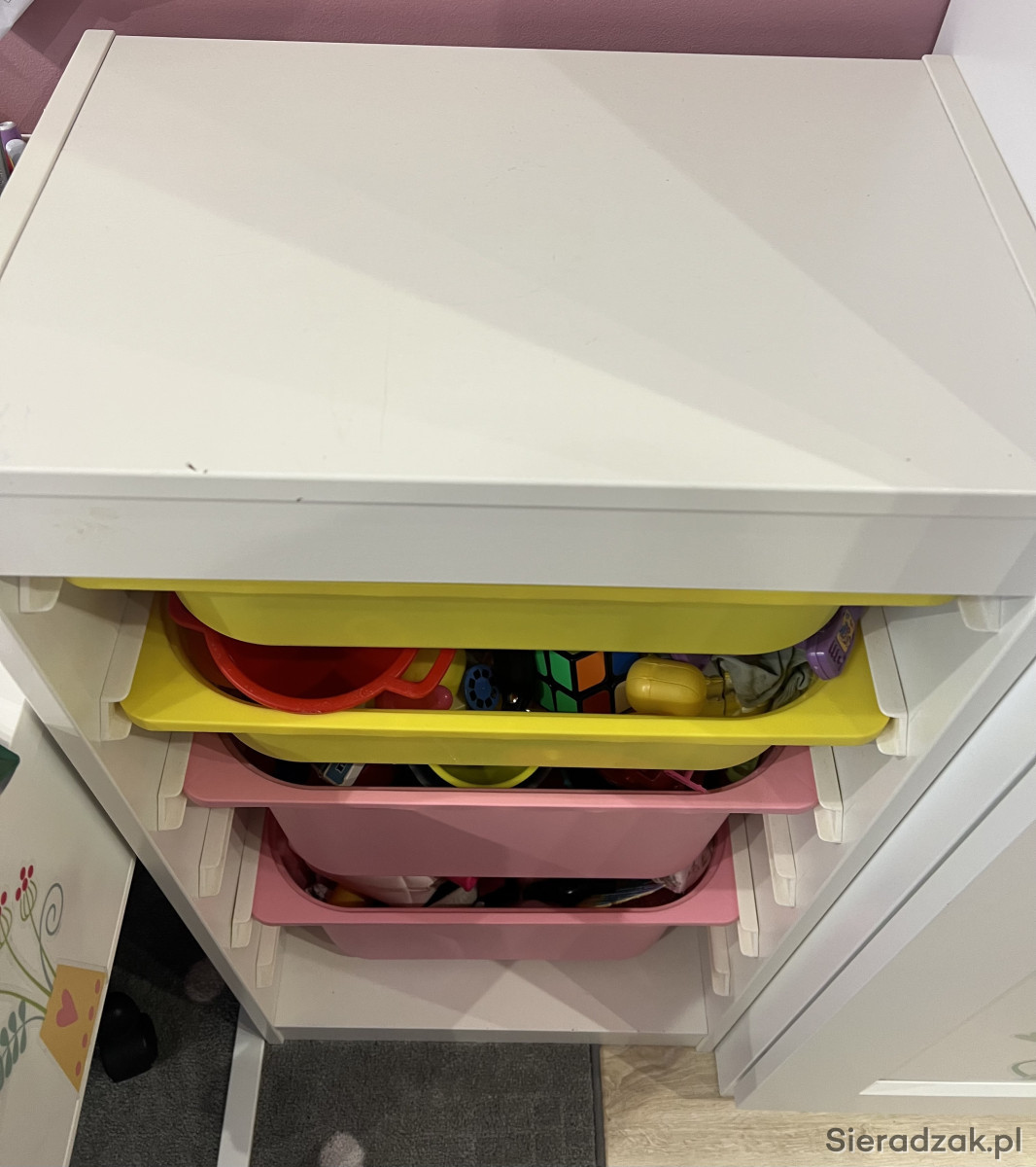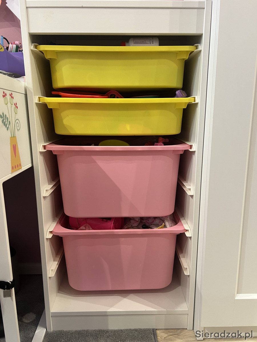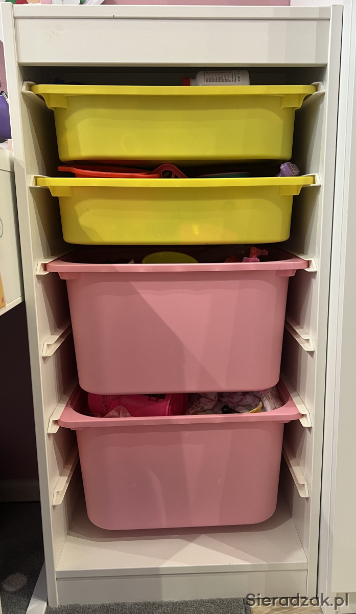 Sprzedam szafkę Trofast. Regał z pojemnikami, biały. Pojemniki w kolorze żółtym i różowym. Wymiary 46x30x94 cm.