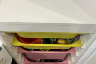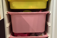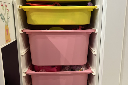Niski mebel z miejscem do przechowywania, dopasowany do wzrostu dziecka. Dzieciom łatwiej jest dosięgnąć i posprzątać swoje rzeczy