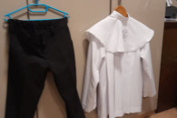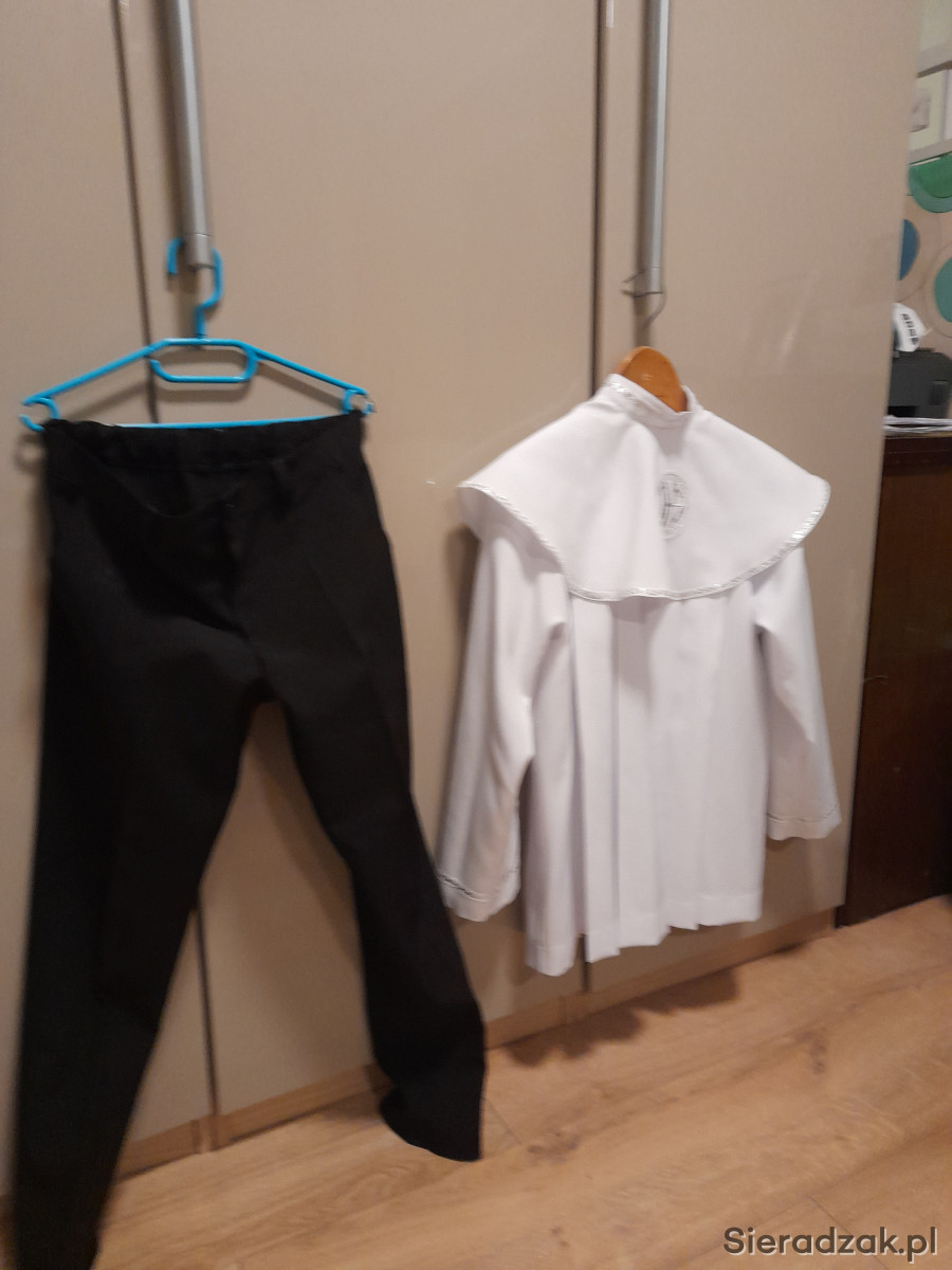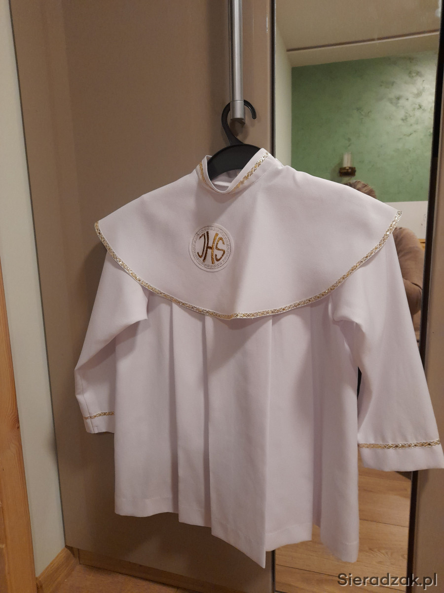 Sprzedam albę ze spodniami . Długość Alby to70 cm dludosc rękawa to 50. Długość spodni to 86 , pas 75. Pas regulowany . Mam dwie alby jedna w kolorze ze złotym druga ze srebrem do wyboru.