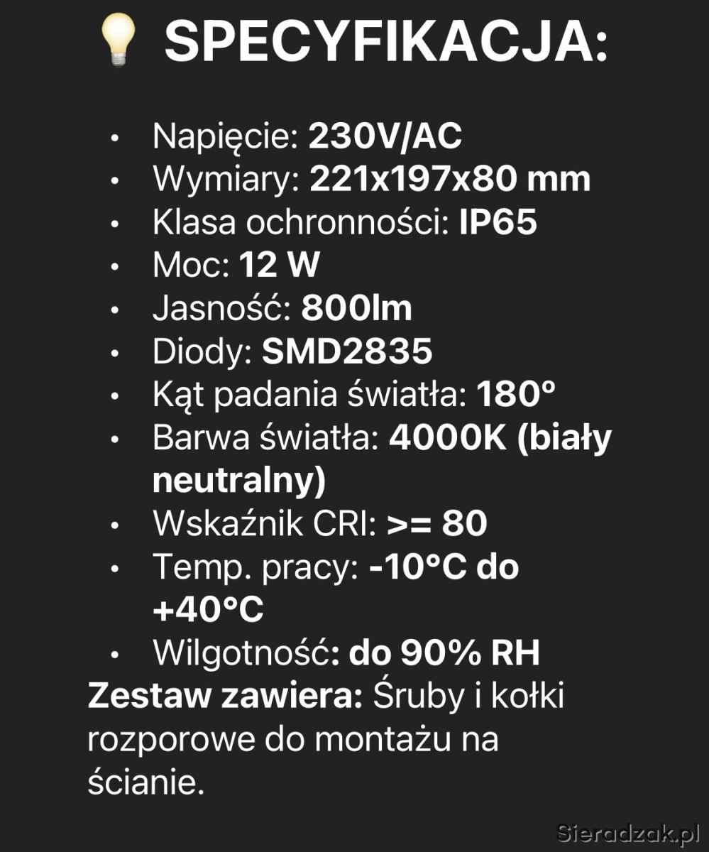 Witam. Mam do sprzedania zestaw kinkietów na dom. Ilość w zestawie 7. Kinkiety użytkowane 2 tygodnie. Sprzedaję, gdyż nie odpowiada mi barwa światła. Cena za całość wyniosła 571,97 zł. Posiadam fakturę. Barwa światła neutralny biały. Zasilanie sieciowe 230V. Wymiary: głębokość 19,7 cm. Szerokość 8 cm. Wysyłka w opakowaniu zastępczym. Cena nie podlega negocjacji.