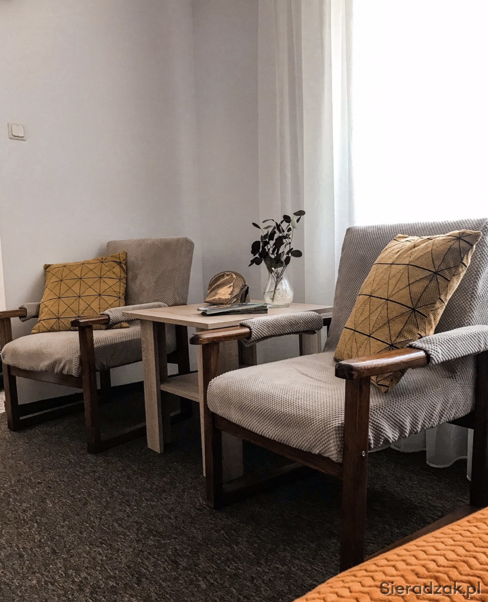 Oferuje fotel na drewnianej solidnej konstrukcji, siedzisko można odkręcić i zdjąć pokrowiec