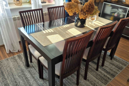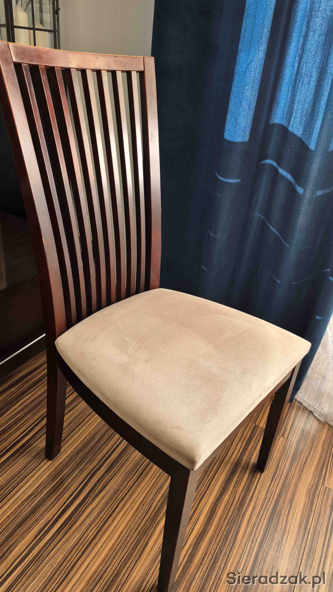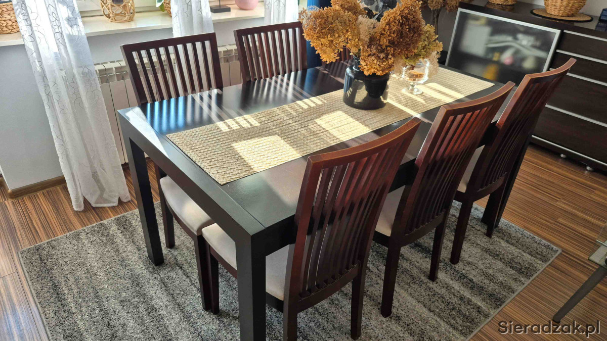 Sprzedam używany stół rozkładany z krzesłami w bardzo dobrym stanie, w kolorze ciemny brąz (wenge):