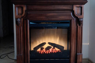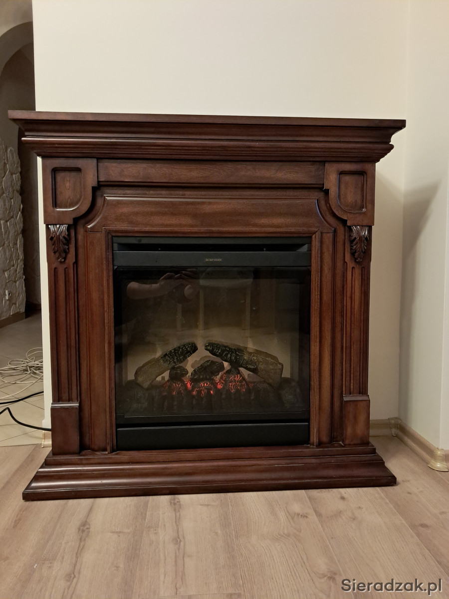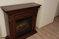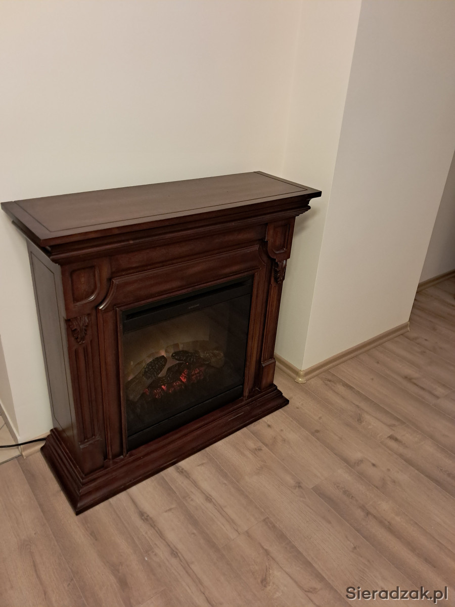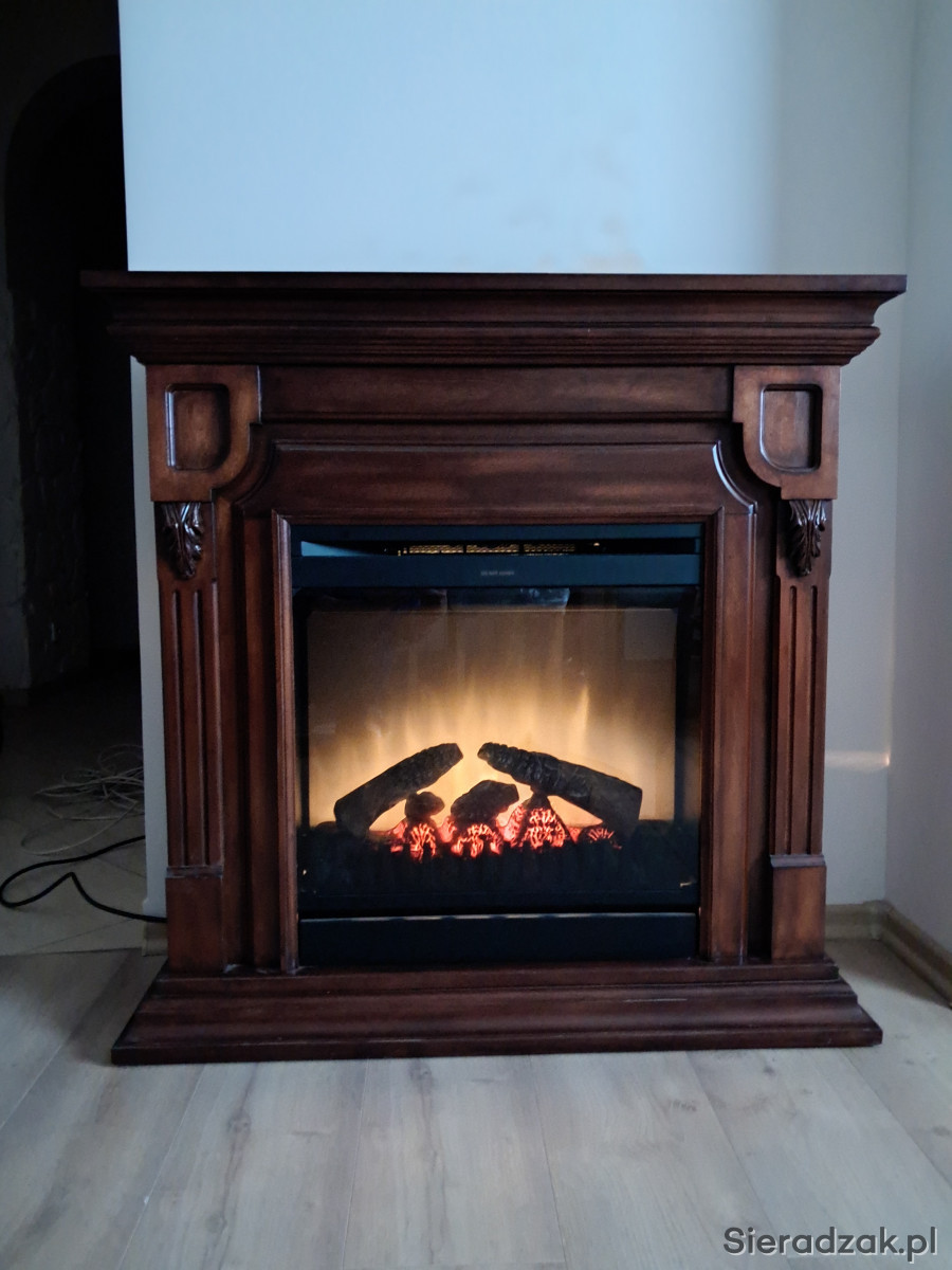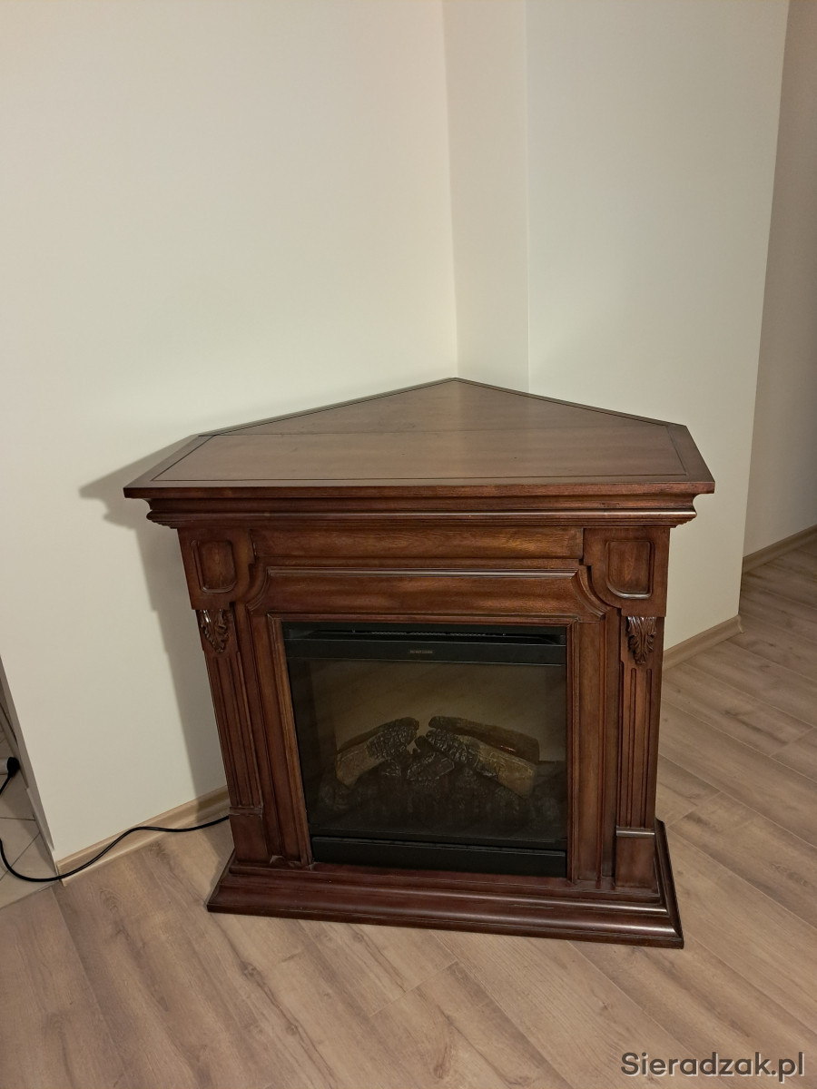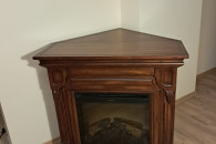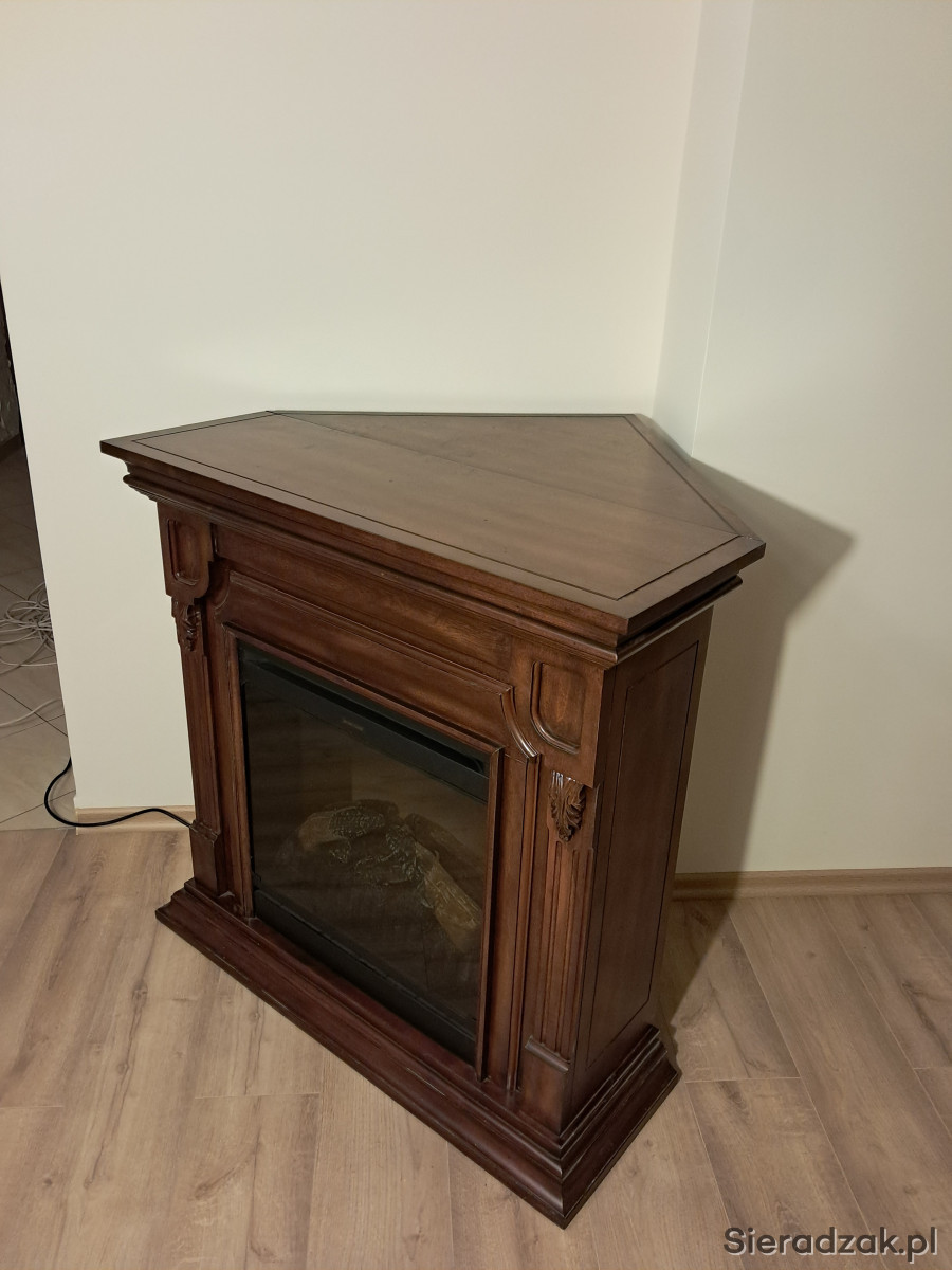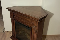Narożny kominek elektryczny w ciemnobrązowej drewnianej obudowie. Posiada ozdobne elementy wykończeniowe i wbudowany panel sterowania. Idealny do przytulnego wnętrza. Można postawić go przy ścianie lub przy zastosowaniu dodatkowej zabudowy, w rogu pokoju.
