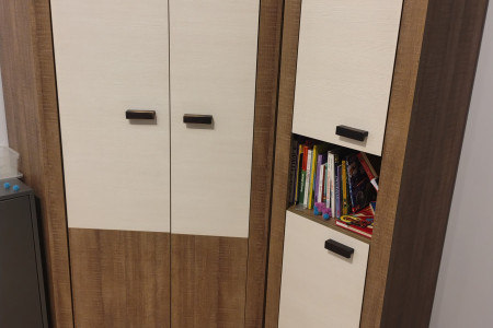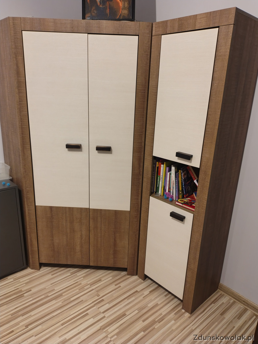 Sprzedam zestaw mebli młodzieżowych w skład którego wchodzą szafa narożna o wymiarach wysokośi 180cm, lewa i prawa strona o wymiarach 97cm szerokości głębokość boków 37cm w środku półki oraz dwa wieszaki na ubrania . Regał wysokość 180cm szerokość 50cm głębokość 37cm. Komoda o wymiarach 110cm głęboka 37cm wysokość 93cm. Biurko o wymiarach, szerokość 110cm głębokosc 52cm wysokość 75cm. Meble są w stanie bardzo dobrym i nie pochodzą z sieciówki. Tel 7.9.2.6.8.6.1.1.1