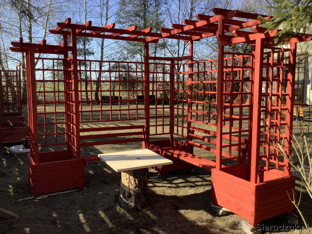 Pergola narozna z dwiema ławkami o wymiarach 127cm . Całość 270x270cm.
