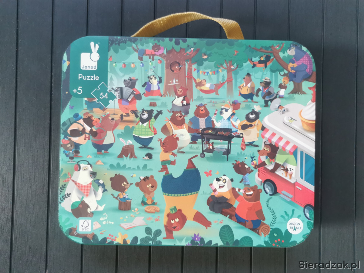 Zestaw puzzli w walizce Rodzina misiów francuskiej marki JANOD składa się z 54 elementów, po ułożeniu tworzących piękny, bogaty w szczegóły obrazek, przedstawiający rodzinny piknik licznej gromady niedźwiedzi.