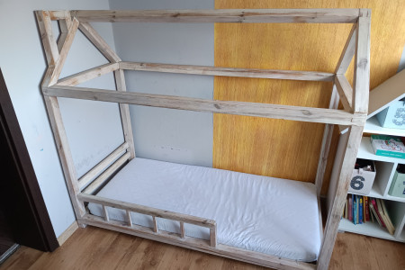 Sprzedam łóżko domek. Materac 160x70. Wymiary łóżka 170x88. Transport we własnym zakresie i tylko w całości ze wzgledu na to ze lozko było ręcznie robione i nie ma mozliwosci go złożyc.