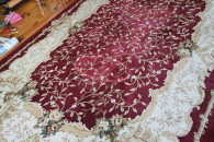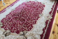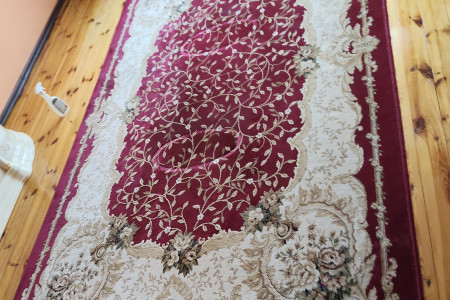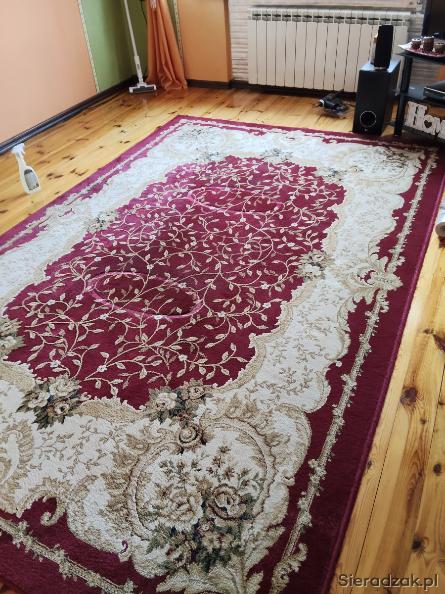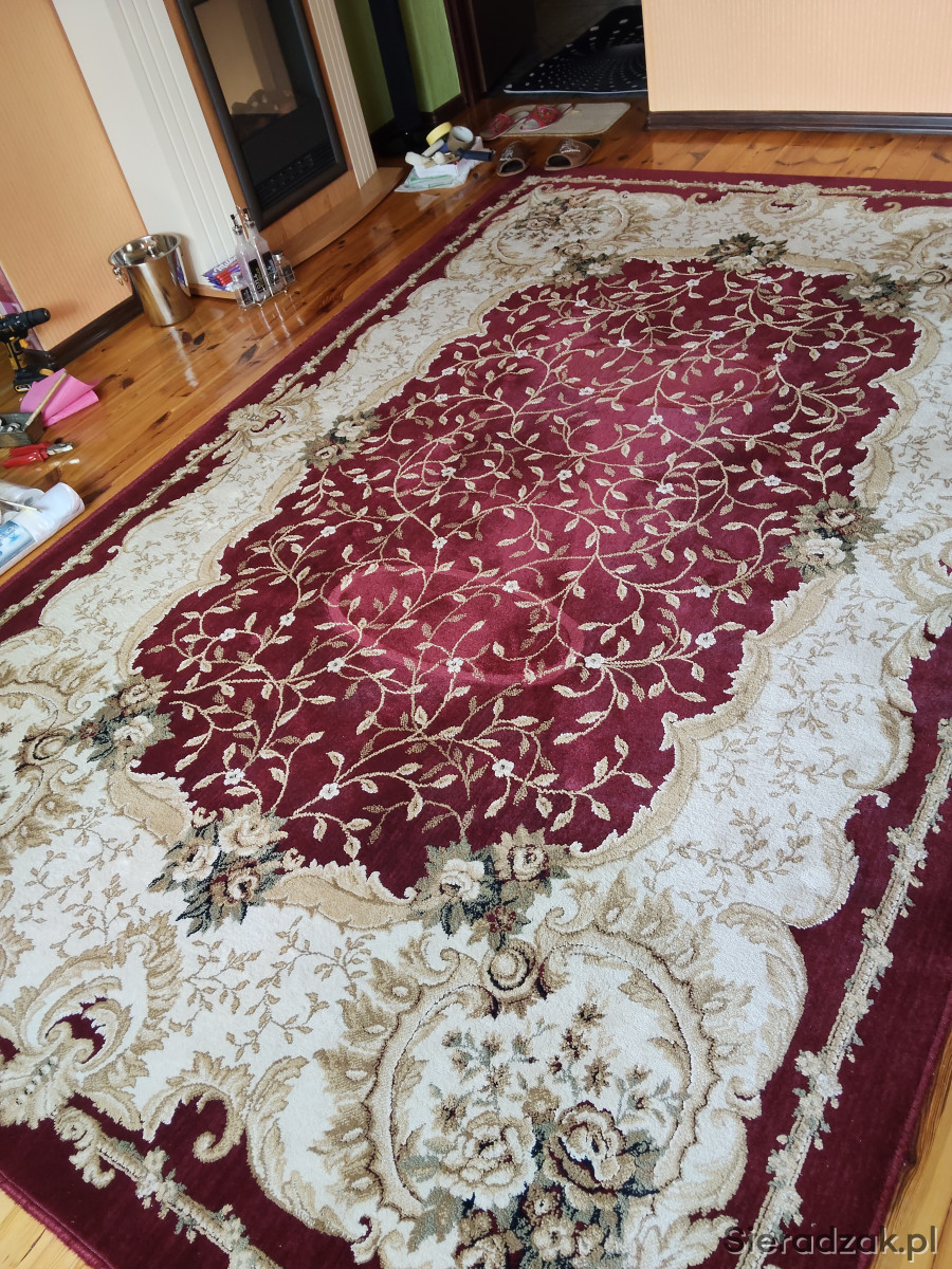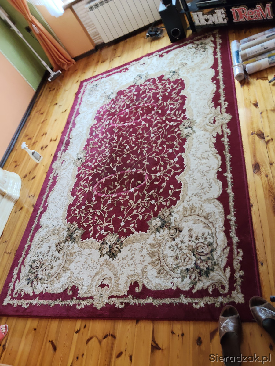Sprzedam dywan do salonu w kolorze bordowym z białymi dodatkami.