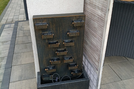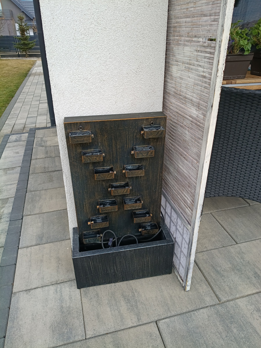 Fontanna na taras albo na ogród . Daje uczucie jakby rzeczka płynęła . Woda spada lekko dając odgłos strumyczka górskiego . Polecam . Relaksuje i wprowadza nastrój. Zasilenie sieciowe 230 v. Pompka do wody. Materiał mosiądz .